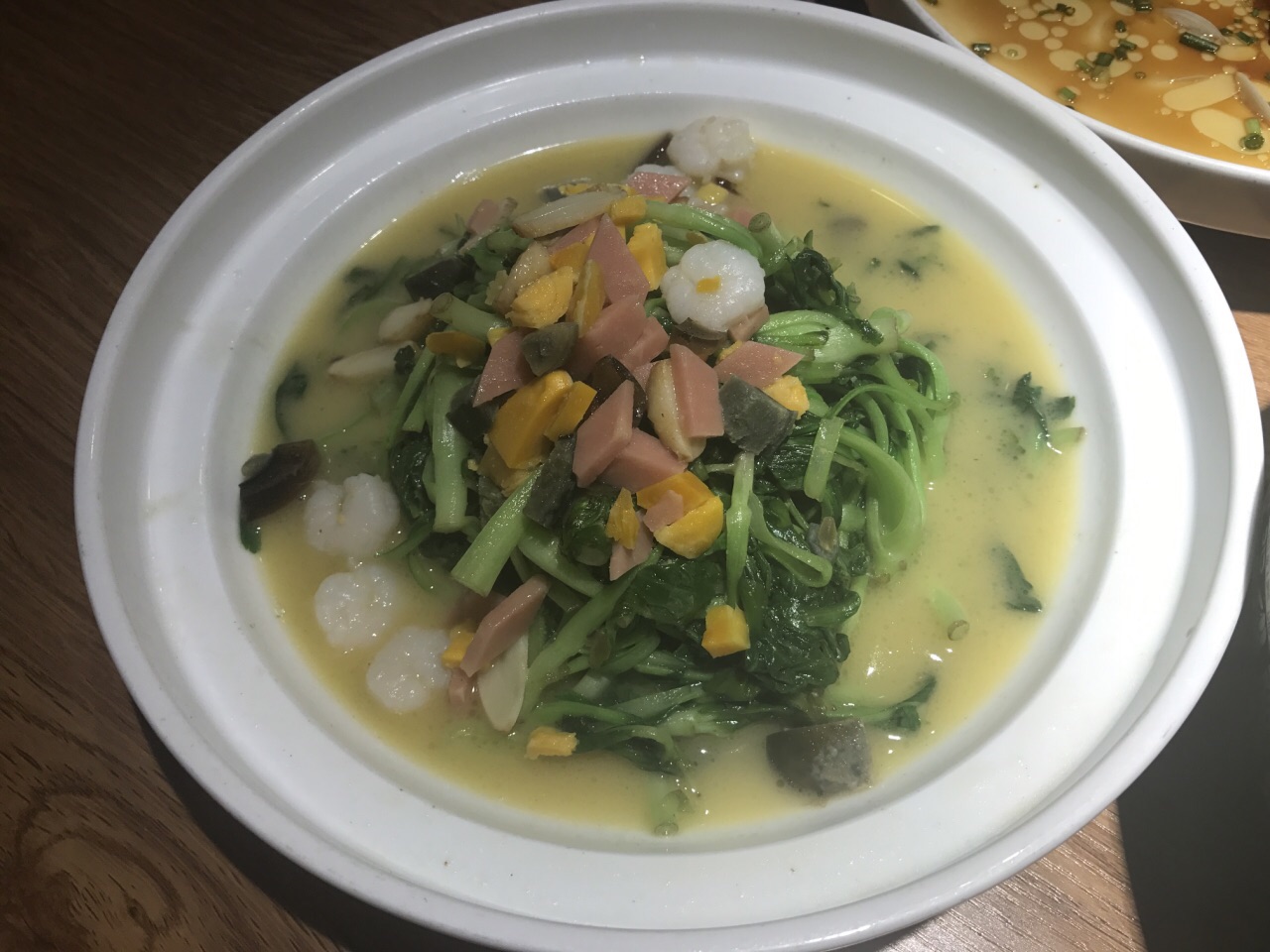 在幸福里的尽头番禺路上找到了一家味道不错的餐厅 menu上都是上海人耳熟能详的我各种家常菜 三个人点了蛤蜊炖蛋 酸菜鱼 牛肉萝卜和一个蔬菜 再加三碗饭 人均64元 厨师手艺很赞 每道菜都好吃的掉眉毛 只是有个困惑 在酸菜鱼汤里发现了一片腌火腿 不知道是不是店家的故意为之