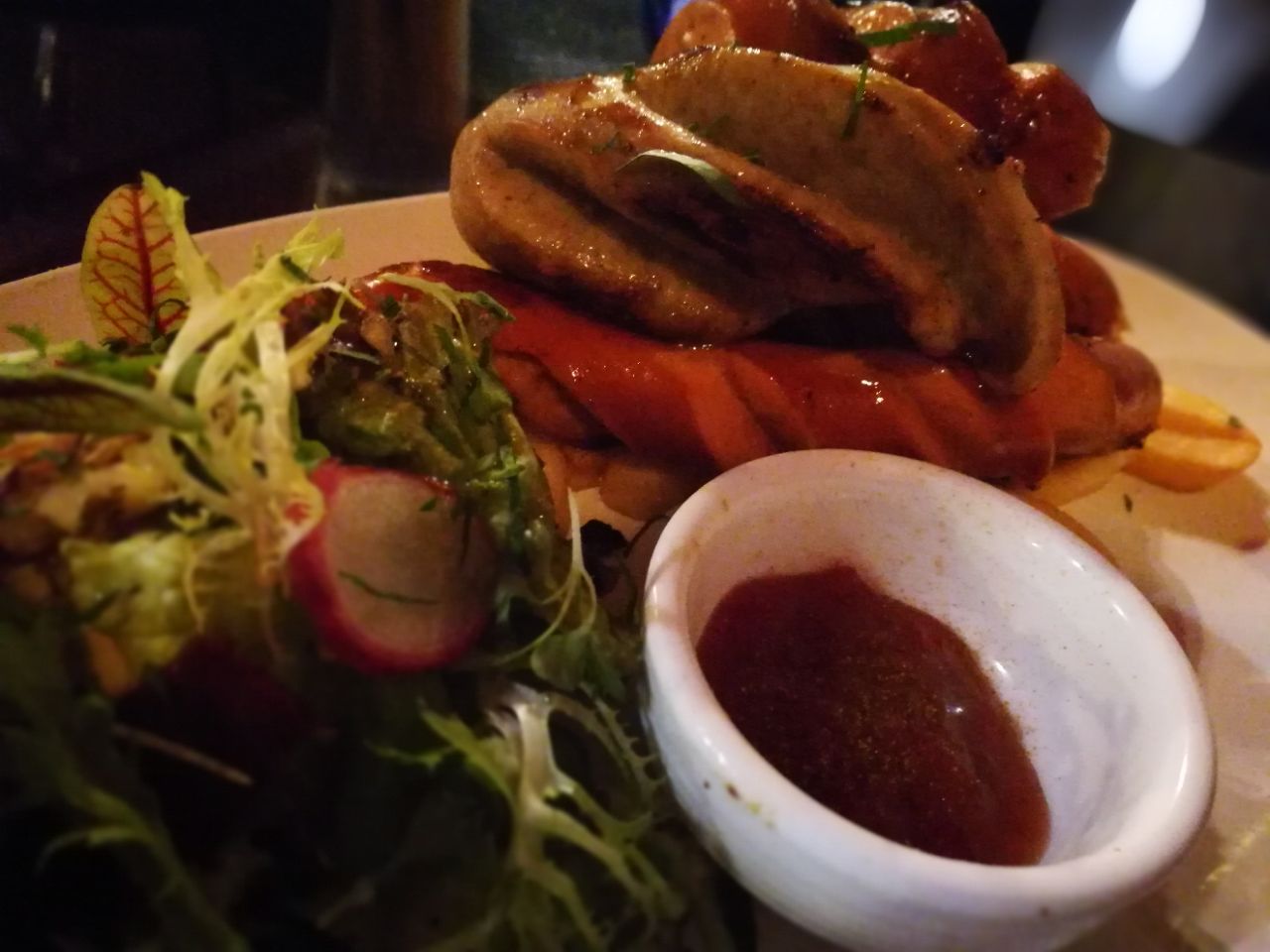 很美式的餐厅,感觉很舒适,貌似都很多国际友人喜欢这里。初看价格可能同地段略贵,但是上菜后立马收回这种想法,份量真的杠杠的。对食肉兽的俺来说,德国香肠套餐真的是大满足,份量不少还配上薯条少量的青菜沙拉,荤素搭配营养均衡(•̀⌄•́)朋友点的大虾扁意面也好好吃,推荐大家可以一试。