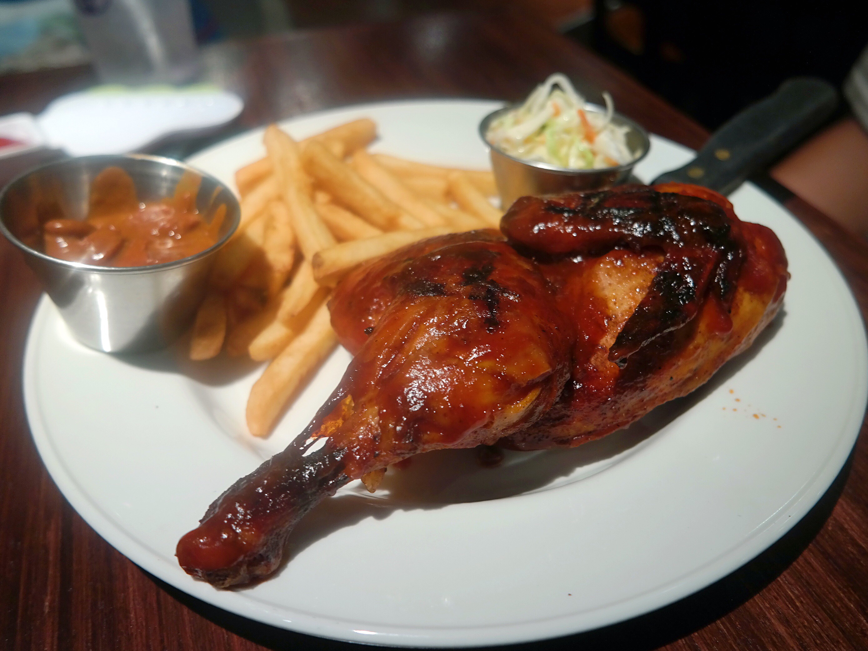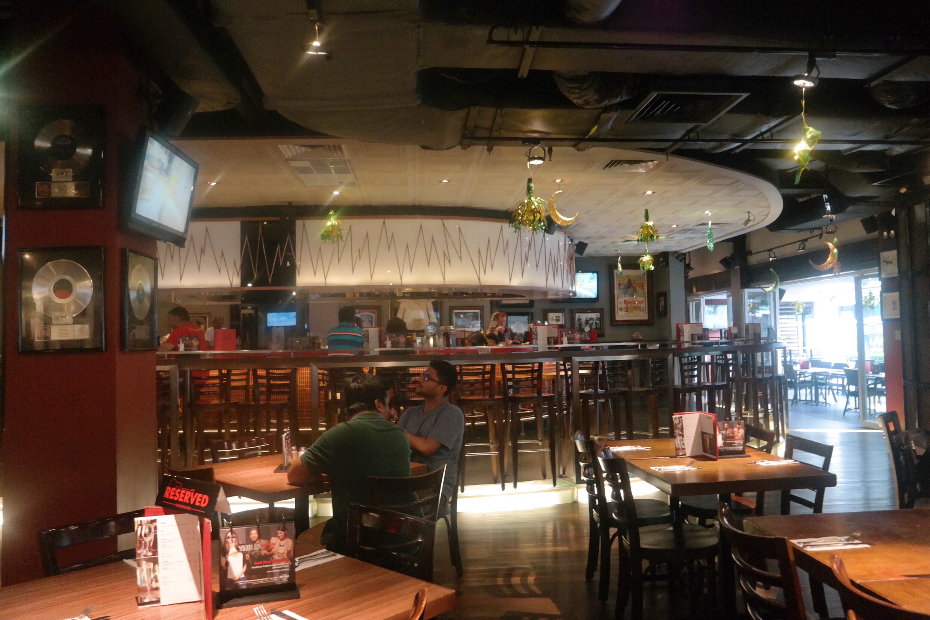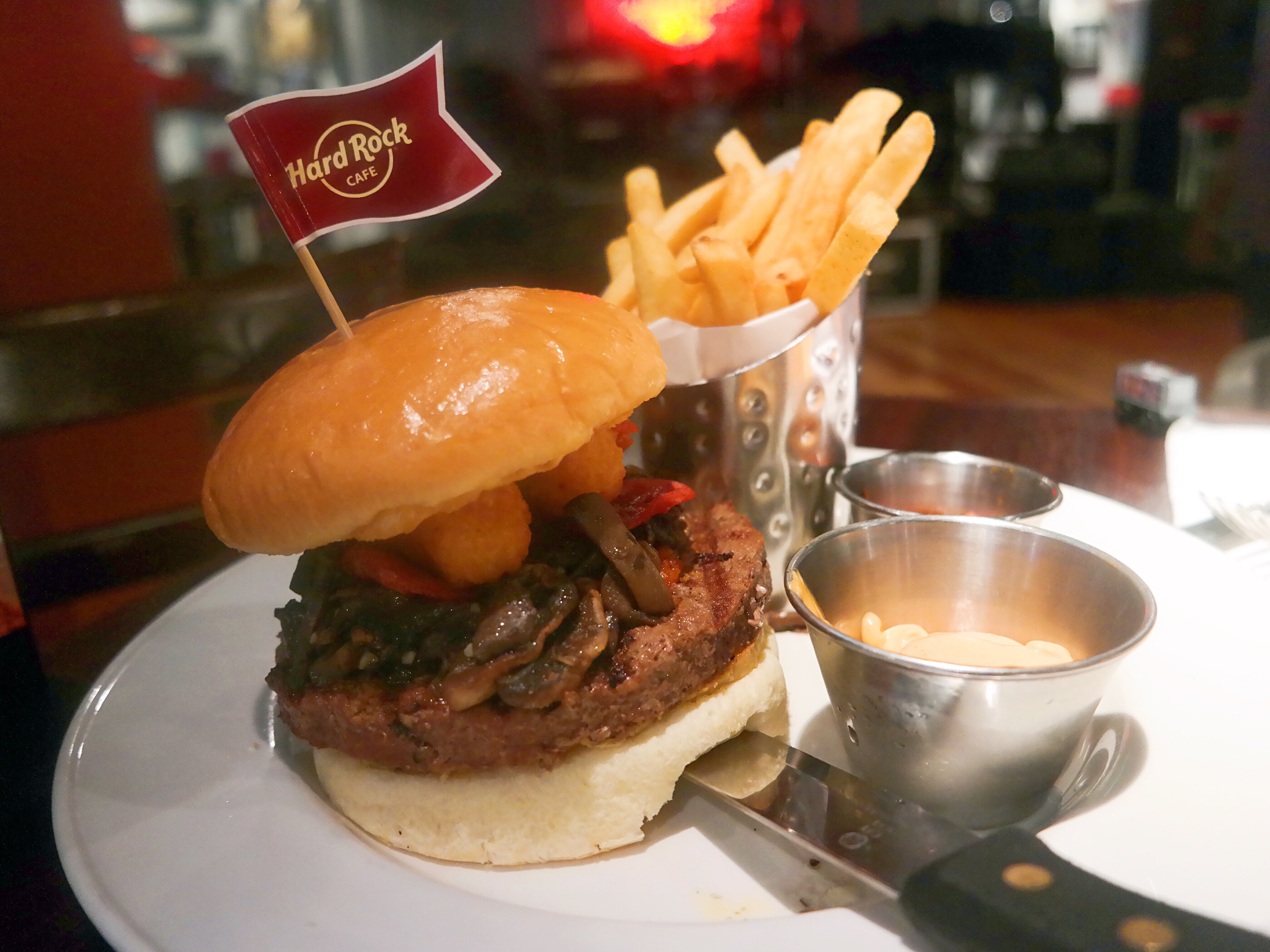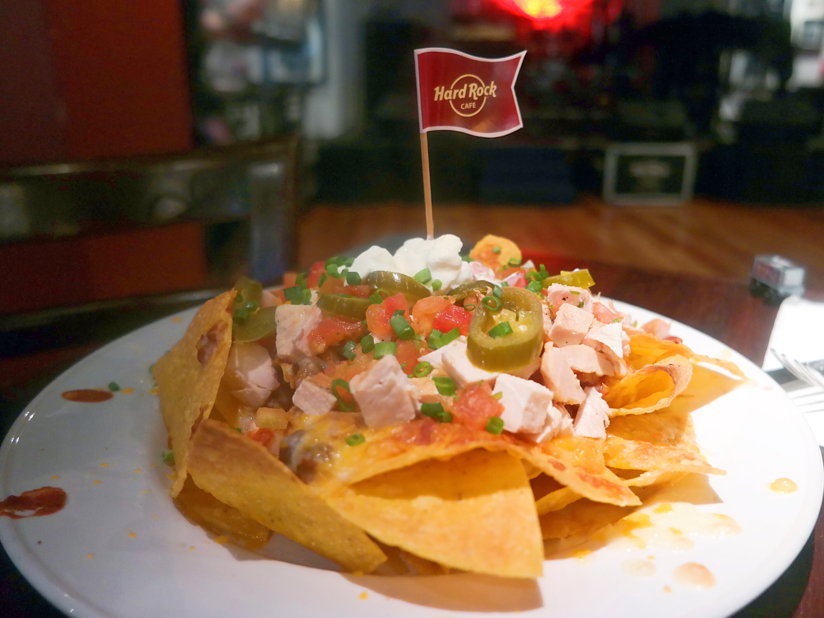 这间餐厅就在市中心,很容易找到,喜欢它家门口招牌那的那架摩托车,看着很拉风。去的时候还挺早的,餐厅虽然放着摇滚乐,但感觉很宁静。服务员很热情友善,食物选择也蛮多的,墨西哥干酪玉米片是非常棒的前菜,配上特调的饮料是绝配,玉米片的分量很大,感觉只是一边吃玉米片一边聊天都能饱了。主菜的分量更大,意大利汉堡的肉新鲜多汁,烤鸡肉也是火候刚刚好,皮焦肉嫩。喜欢它的mango berry饮料,看很多人都点这个,味道酸甜的很清爽,固定水果的签子是个小小的吉他造型,非常可爱