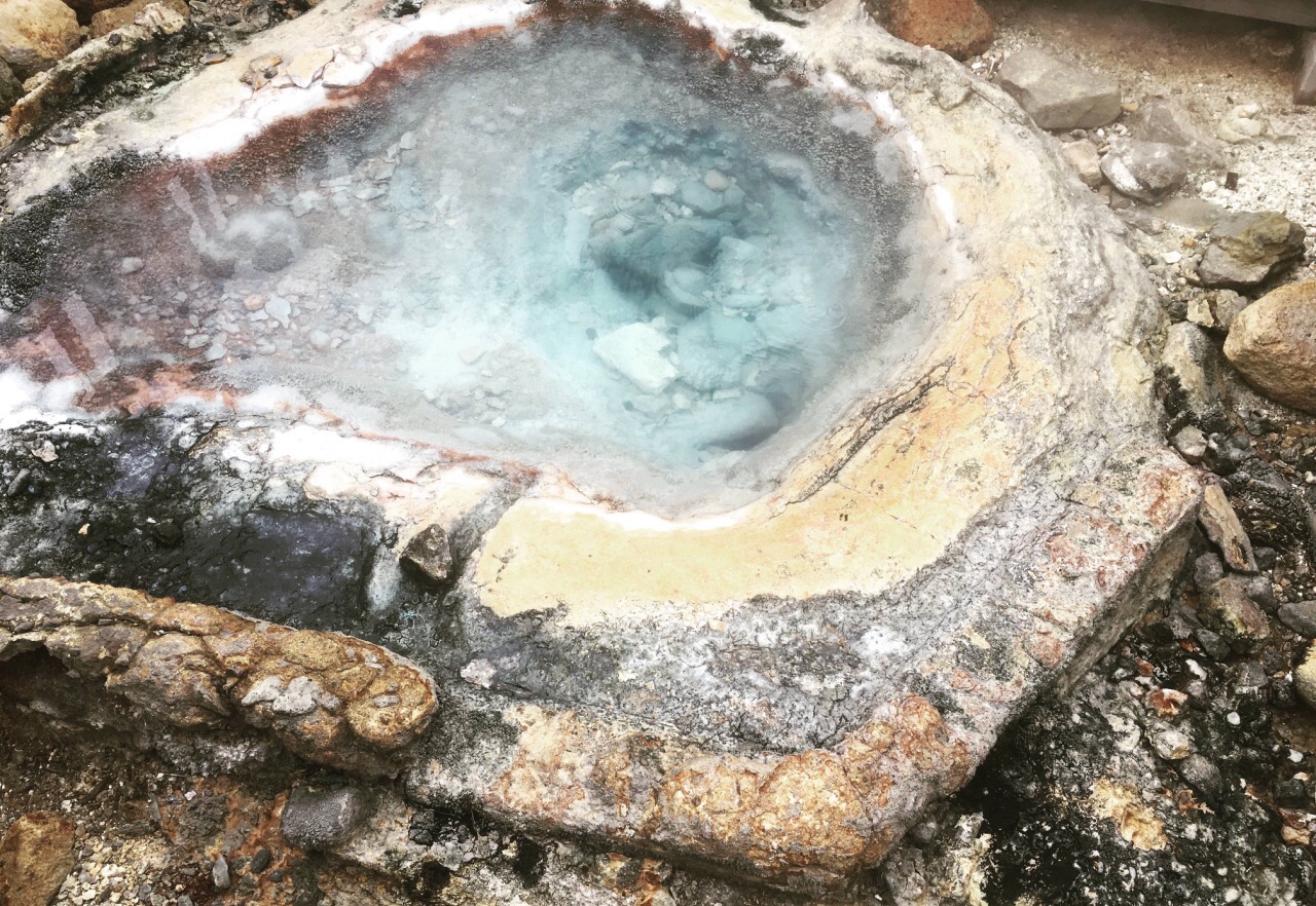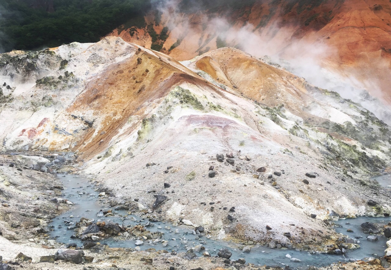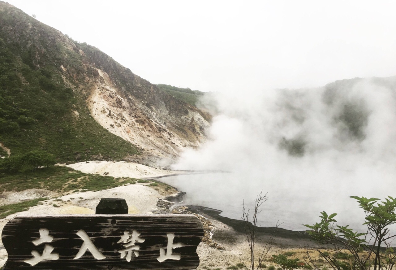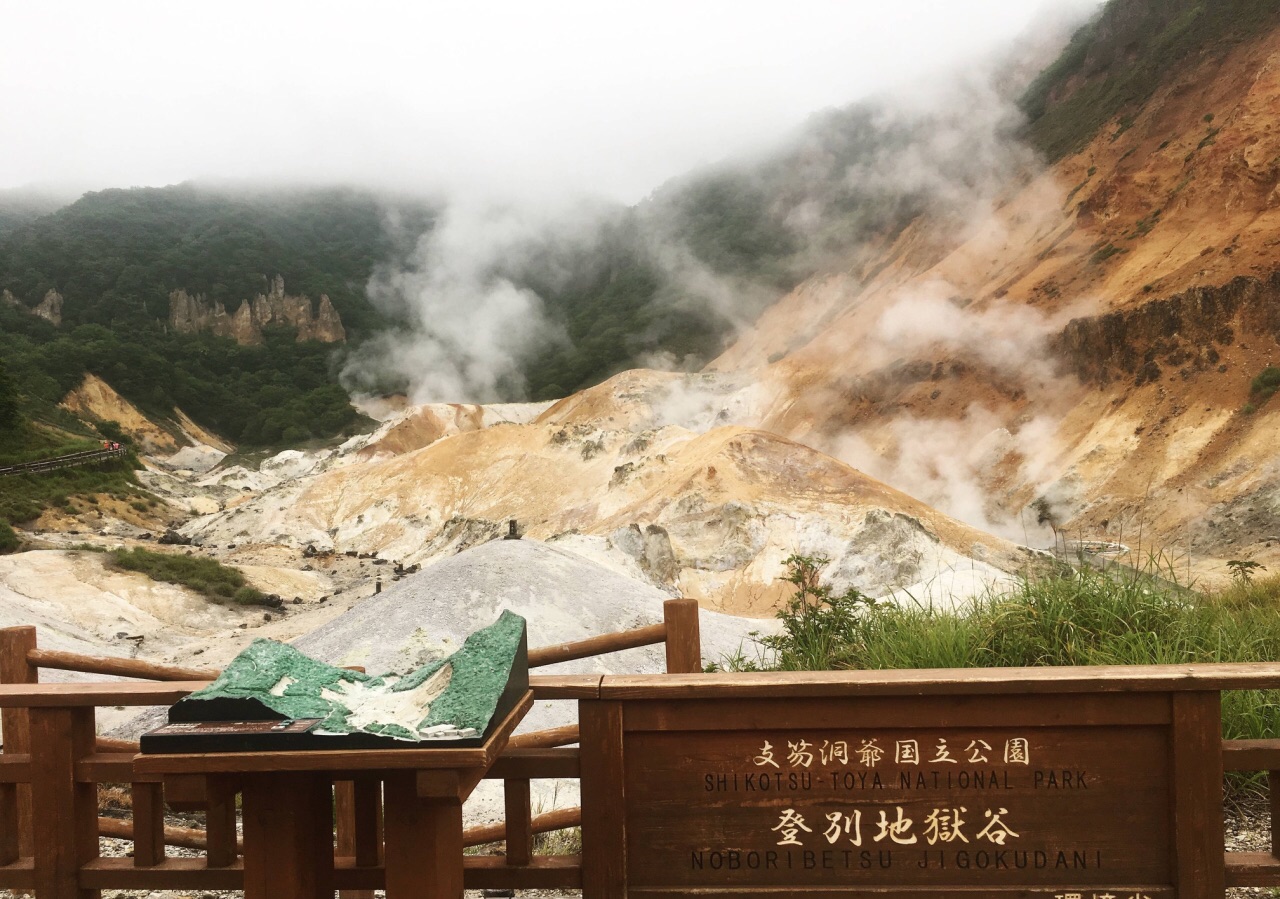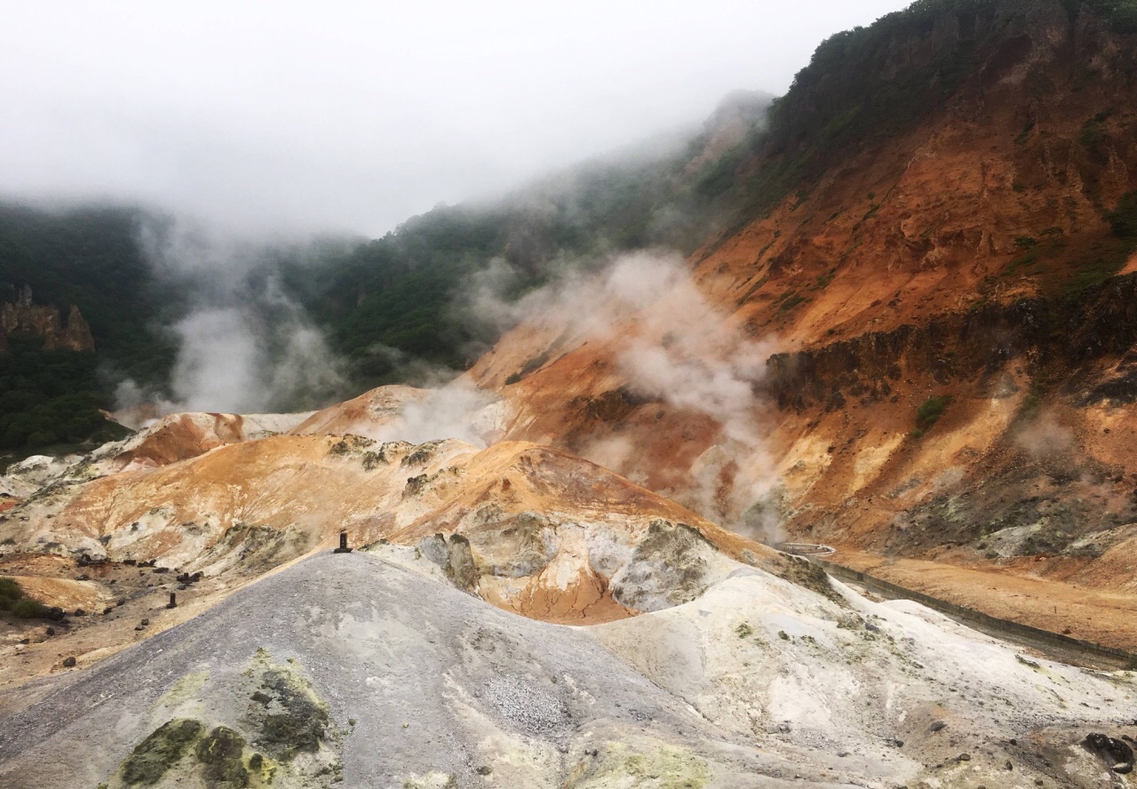 地狱谷很壮观火山爆发后由熔岩所形成的一个奇形诡异的山谷 升腾的浓烟 喷水的咕噜声 还有无数细小的喷水口 处处烟雾缭绕 周围空气里充满了浓郁硫磺味 灰白和褐色的岩层加上许多地热自地底喷出 真的像是人间地狱