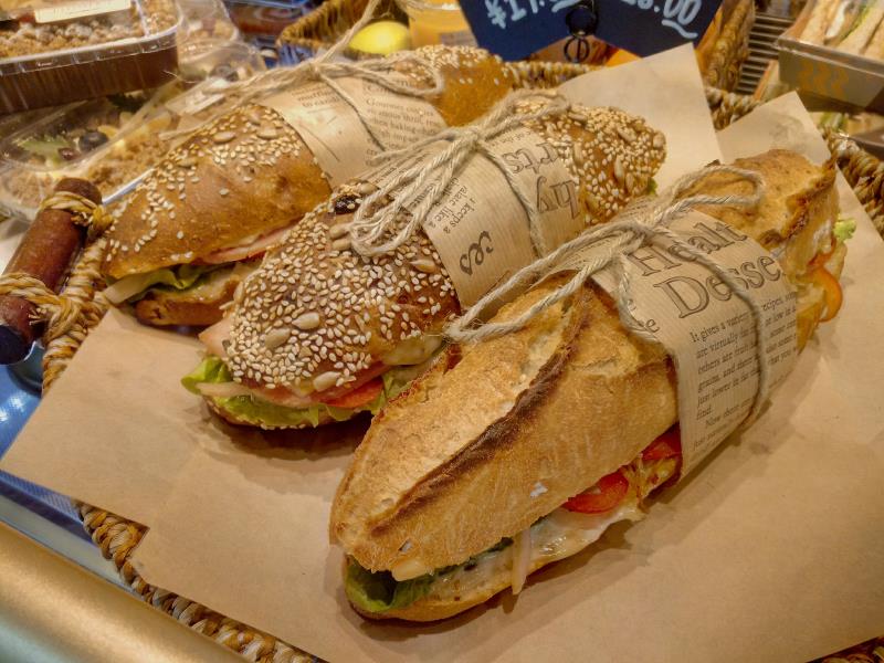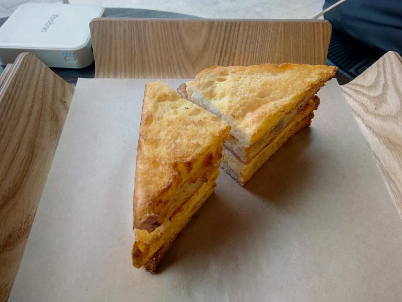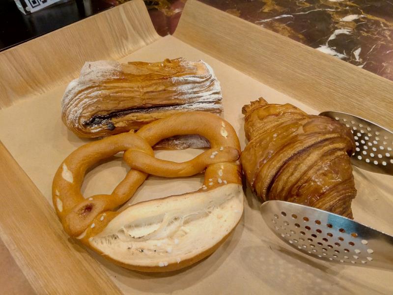 南京的红跑车开到杭州来了,下午特地拐过来尝鲜。其实是被朋友推荐过来的,这才特地换了三辆公交车,从余杭良渚那边赶过来。想想来一趟也不容易,所以各种类型的面包都买了一点尝尝。估计店员没见识过吃货探店的精神,把我们误会成其他面包店派来的探子,也是囧然。 说实在的,杭州的大部分面包店基本都吃过了,现在热衷于去上海买面包吃,要探虚实真不用来这儿探。另外,也别总推销办卡,还没吃过就要我办卡,怎么可能会办?面包好吃自然会有回头客,不用说也会来办的,加上还有显眼的办卡优惠公告牌。 话归正题,先说说这儿的面包,种类格外丰富,涵盖面广,基本款该有的都有了。点的原味可颂,让服务员帮忙切了一下,手法生涩,建议多多练习,切面包基本都切小块比较好。 可颂口感很不错,很酥,吃着有弹性有张力,味道不错基本满意,挺好的;至于巧克力味的可颂,其实更喜欢作为内陷,那种吃着流心的巧克力可颂。 可颂吃完之后,再挑了一个普雷结,海盐口感。作为德国碱水面包,外形一般,颜色太浅了,不够红亮,吃着没有想象中的柔软中带着韧性的那种感觉,也不用期待两头会有焦脆的口感,不怎么推荐。 第三款巧克力酥,带着拿破仑的那种口感,层层叠叠的酥皮让我很喜欢,巧克力酱带来的口感也很不错,推荐~ 这边的三明治,有四种不同类型。第一种是放在面包区,外面裹上蛋液,内陷很丰富,双层不同口味的内陷儿,味道不错,建议不要加热,加热之后的面包口感就变差了,反而直接吃会更好一点;第二种是冷藏柜里,包装好的鸡蛋吞拿鱼三明治,配白土司,馅料够多,适合买回去当早饭;第三种虽然也在冷藏柜里,但卖相最好,用粗绳子绑着,因为块头太大,感觉买了吃不下,下次再来过。最后一种就是普通的小三明治,无需多言。 蛋糕方面,为了安全起见,选了一个最能体现蛋糕口感的淡奶小方。买的时候记得千万注意看生产日期,最好挑当天出品。蛋糕胚本身不错,吃着绵软,但是上面的奶油太一般了,吃着有那么点腻,不是很喜欢。 临走前再试了一下肉松酥和奶酥,记得上面有黑芝麻的是甜味的奶酥,没芝麻的则是咸味的肉松酥。上面的酥皮口感偏硬,馅料藏在底层的面包里,存在感太弱了。 最后,一般面包店都会有小片的试吃,方便顾客尝味道选择面包,下午过来的时候没发现有,据说晚上才会有?