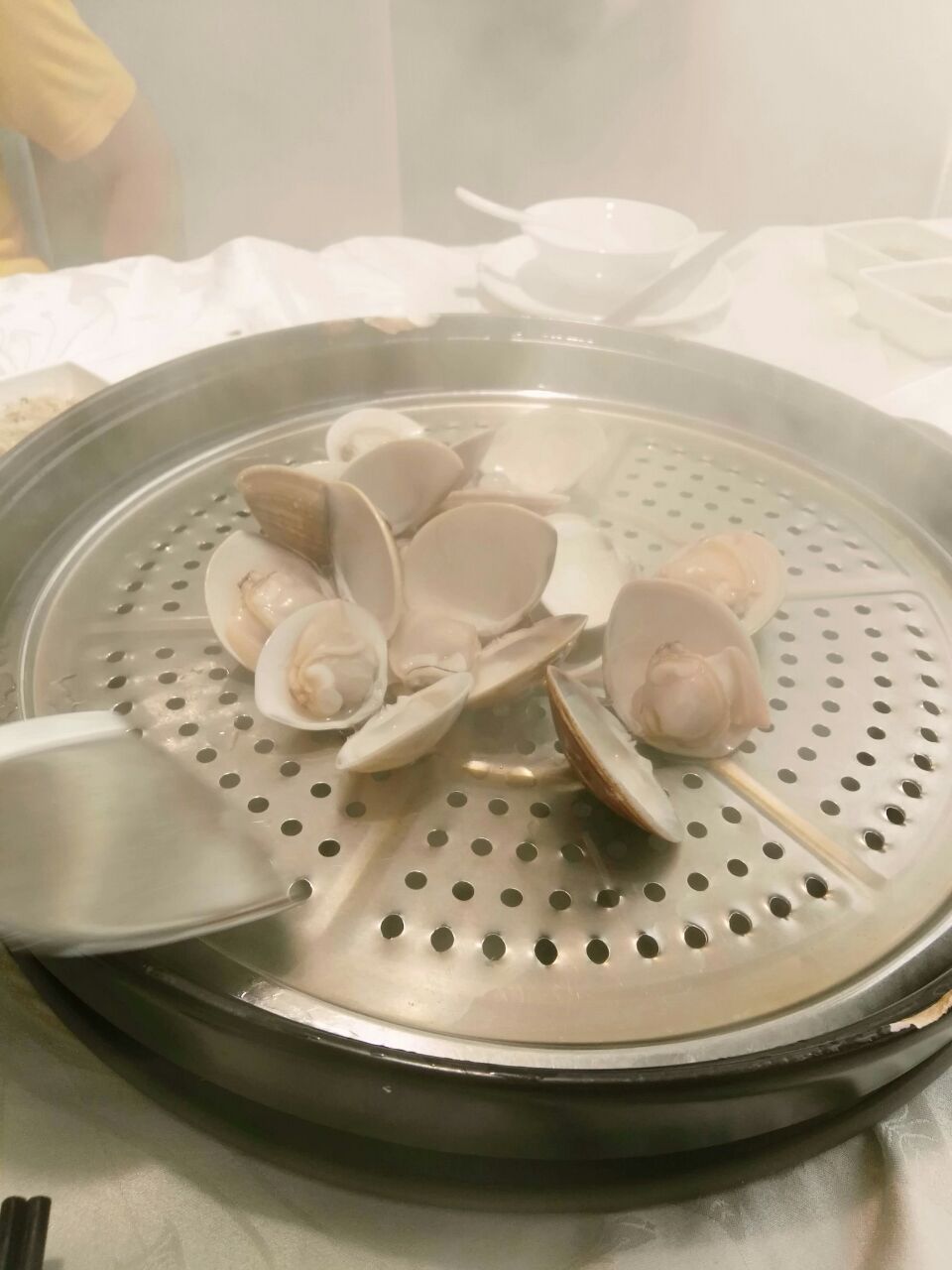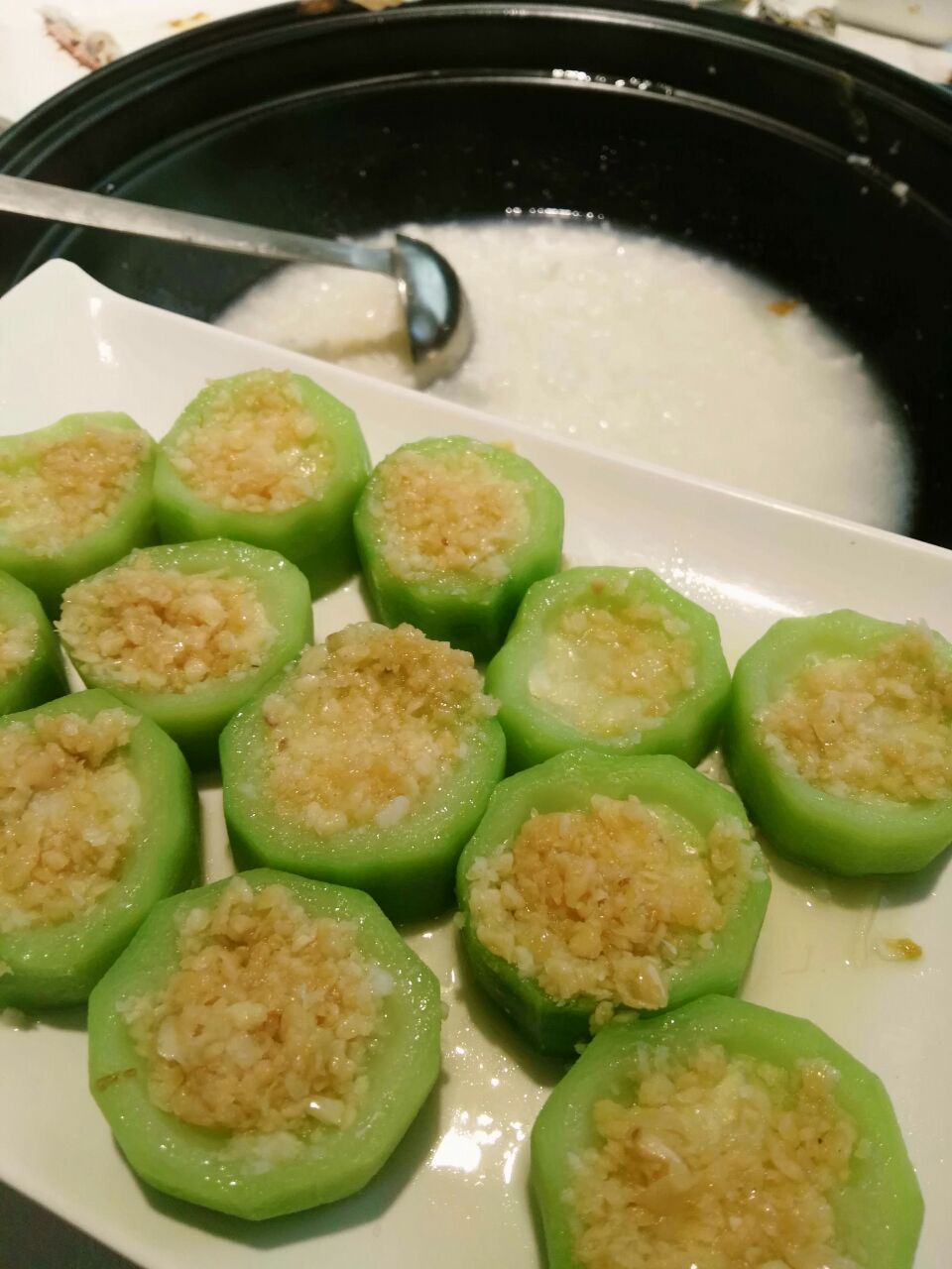 一到湛江,跑到观海长廊,蓝天白云下的观海长廊非常美丽。这家越百海海鲜蒸锅,就在观海路上,现点的海鲜在蒸锅里蒸熟,蒸锅底下,放米、水、排骨、淮生,当所有的海鲜都蒸完以后,海鲜汁滴在粥里面,鲜美异常。(这家店的所有的海鲜都非常新鲜。)唯一不好的就是要等位,12:40几过去,还等了二十几分钟。