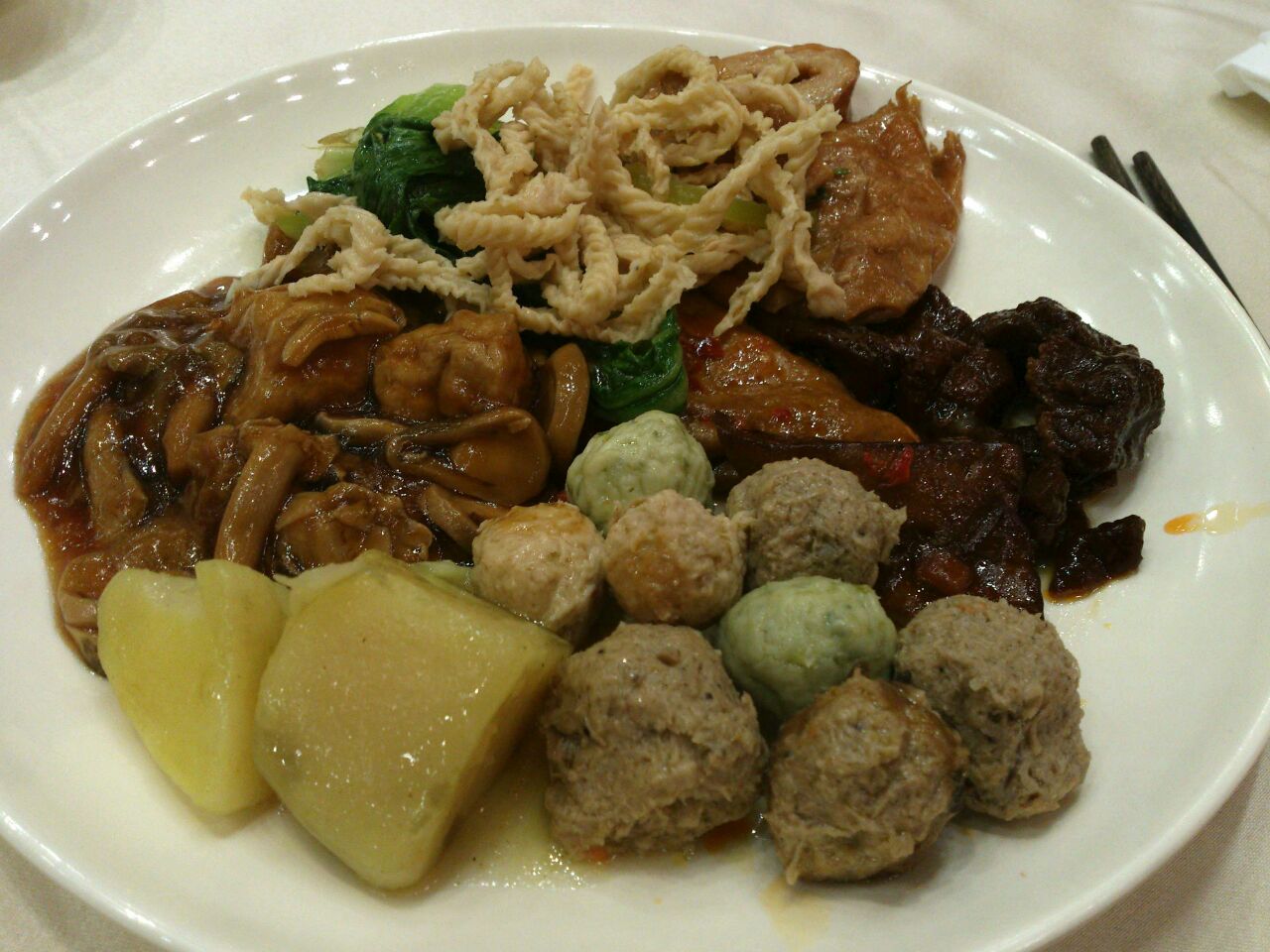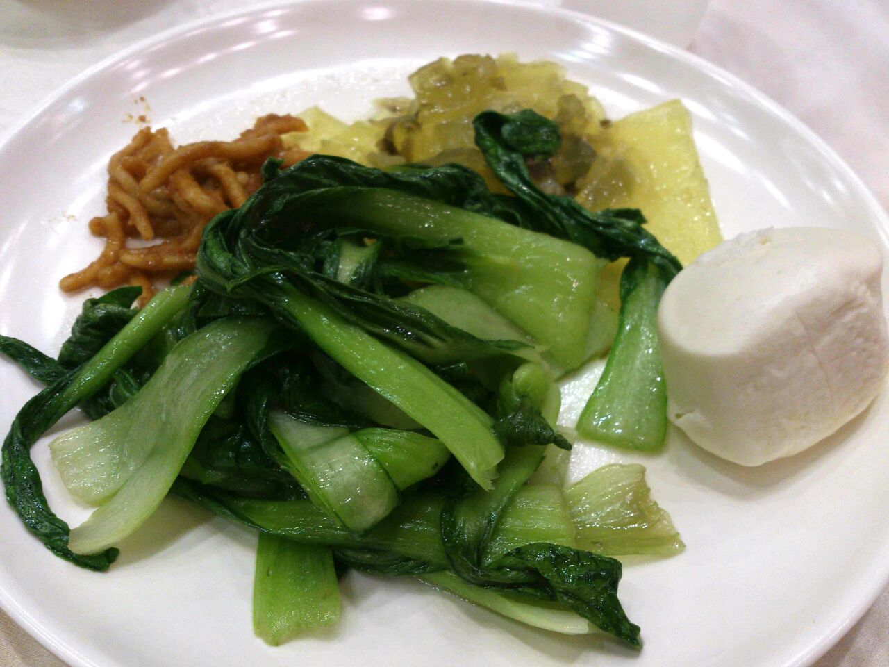 菜品的选择是不少的 三十种肯定是有的 地方也很大 绝对不会没有位子 就是这餐台上的台布 麻烦油渍可不可以洗掉啊 看着很脏哎~ 77一共就拿了两次 第一次看着新奇的就想尝尝 结果发现看起来像肉的 一口咬下去是豆腐渣的口感 比直接吃素的更令人火大! 所以第二次就干脆拿了一盘子的青菜 这样吃木有欺骗感 比较合理~