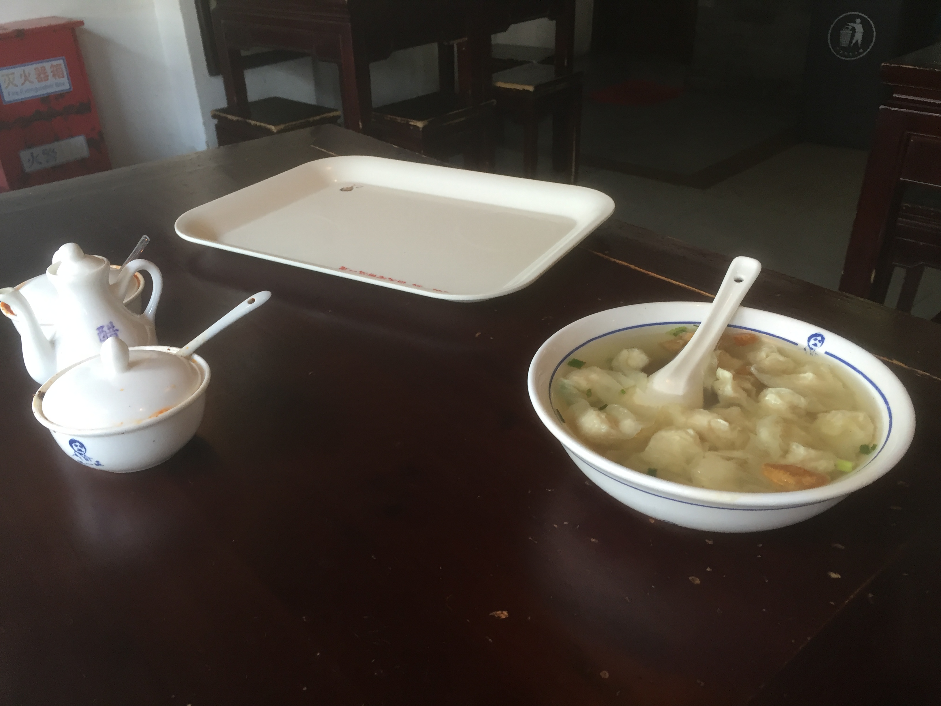 跑去逛屯溪老街, 之前就在网上看到介绍, 屯溪老街也好, 整个黄山貌似馄饨都很有名。 到了屯溪老街看到馄饨很多, 什么一担、老馄饨等等, 感觉花色很多。 各种做法多少都有些出入。 跑去比较网上热门的馄饨店, 就是汪一挑了。 看湖南卫视之前还和汪一挑合作, 由汪一挑本人亲自出马, 做馄饨给明星们吃。 现在在老街的店里, 还挂着硕大的液晶屏电视, 播放着这个拍摄过程。 里面明星不少, 最抢眼的是林青霞, 没想到还出镜了, 非常意外。 跑到老街逛累了, 也特意找的他家, 据说是总店, 非常有名。 进去看到来的游客不少, 很多也是慕名而来。 门口放着两个馄饨器具, 估计是以前挑在路上卖的器具。 看他家环境整洁, 花色还很多, 要了他家特色鸡肉馄饨, 感觉馄饨大小介于小馄饨和大馄饨之间, 更偏向于小馄饨的类型。 一碗馄饨里面有不少调味料, 看还有油条干, 平时非常喜欢吃油条, 而且觉得他家这种做法, 非常能体现馄饨的鲜味, 感觉很不错的。 看他家来吃的人, 也都在看墙上挂着的大电视, 里面滚送播放着明星们品尝各种美食。 送上来的馄饨味道也很鲜美, 吃着感觉很可口, 他家装修也很简单, 主要是干净, 非常赞的!
