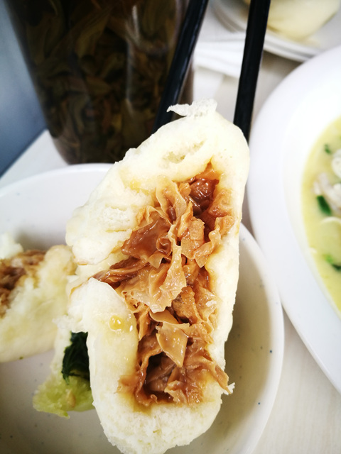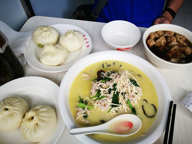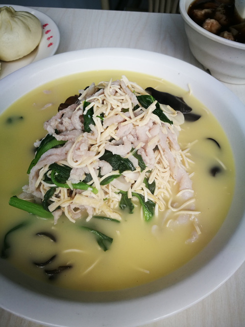 【位置】 在新城花园集贸市场的对面,导航过去位置准确,门口无法停车,路边也没有收费车位,我们去的早,就在路边随便找了个空地停了一下。 【环境】 门面不大,快餐店的装修风格,简洁明亮。 一楼有两个房间,各有20个左右的位子,二楼比较少,座位有沙发座,比一楼要安静舒适一点。 【服务】 这家是分店,包子是在别处蒸好用面包车送过来的,所以要看运气,车子刚来的时候,品种比较全,很快就卖得品种不齐了。 门口右边买包子,直接排队付现金买,袋子是要收费的。 堂食的在收银机那边买,凭小票坐下来给服务员,会送到座位上。 国营老店的营业风格,就不要对服务提过高的要求,否则就是自找没趣。 【食物】 包子的皮不是传统做法,是加了泡打粉的,很白很煊软,卖相不错。 包子馅调的口味极好,咸甜适中,每个品种都好吃。 三丁包、豆腐皮包、萝卜丝包,极力推荐。 烧麦和豆沙包没吃上,遗憾~ 虾籽馄饨,6元一碗,酱油汤底不喜欢,肉馅又大又结实,性价比还是很高的。 大煮干丝,20元,汤奶白鲜美,就是太咸了,干丝是切出来的,不是用的机制干丝,虽然刀工不够精细但也够有诚意了,干丝的口感很好,特别特别多的肉丝在里面,价格也是很实惠的。 干拌面,5元,看很多本地人点了吃,额外加的一碗,面条的口感很好,味道调的特别好,有荤油和蒜泥,拌匀了以后颜色诱人,好吃极了。 【评价】 扬州本地人喜欢光顾的早点茶楼,比那几家春字头的老字号好吃多了,价格也实惠多了,人均20元可以吃得又饱又好。 总店我去过,环境更好点,而且也供应中午晚上的炒菜,这家停车不便,环境象快餐店,品种较少,只适合吃早餐,好处就是高速下来比较近。 豆腐皮、三丁、萝卜丝三种包子,干拌面强力推荐!