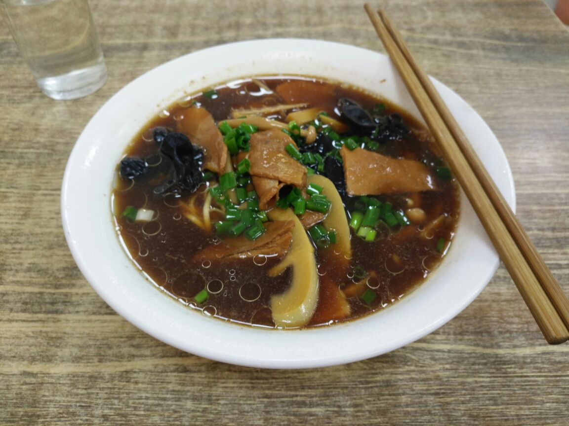 这家店就在乌镇汽车站出来的一条主路上,刚下车就过来吃碗面。老远店里的阿姨就问我要不要住宿,原来他家除了面馆也有客房。要了特色的古镇卤汁面,里面有木耳、鲜笋、肉片等。面是细条扁面,好嚼还有些筋道。汤味很好,口味适中,并不是很咸的那种,吃完也并没有特别想喝水。因为我的饭量小,特意让老板少放了些面,怕浪费,所以正常的量要比图中的大。