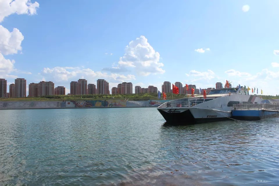 是一个人工湖的公园,晚上大概五点半的时候喷泉就会开,就算是四周围都没有人喷泉一样会开,水费电费都真的是不少,感觉这个城市,真的是有点浪费,不过环境的确是不错,虽然是有点晒,附近也有一条公交线路,而且有三个游艇,上游艇的消费的确是不会了就100块的低消,对面的楼房是一个人都没有,比较冷清,这就是鬼城特色