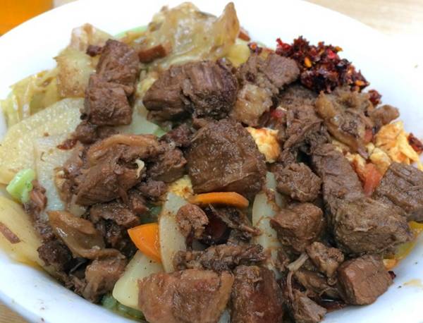 ...的是超级多,牛肉块也入味,油泼辣子也特别香,和臊子,菠菜面混合了,是喷香的,大口不一会就吃光了