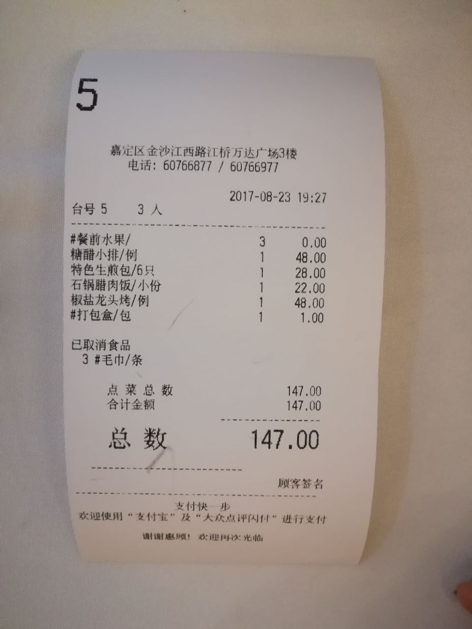 一家比较有名的中餐连锁店,但是服务感觉真的不如他们的价格那么高!如果不是支付宝口碑里抢到的50元抵用券,我想我也是不会去光顾的。 从进门就没有什么人招呼,大概生意太好,也无所谓吧!糖醋小排,龙头烤说是特色主打菜,也就这样吧,量不是很多。生煎包比想象中的要大,还不错。腊肉饭也还行。上菜前会有水果供应,这是唯一赞赏的地方! 买完单还听到边上乘客抱怨从进门已经快半小时了,都没人搭理。希望店家好好改善服务!