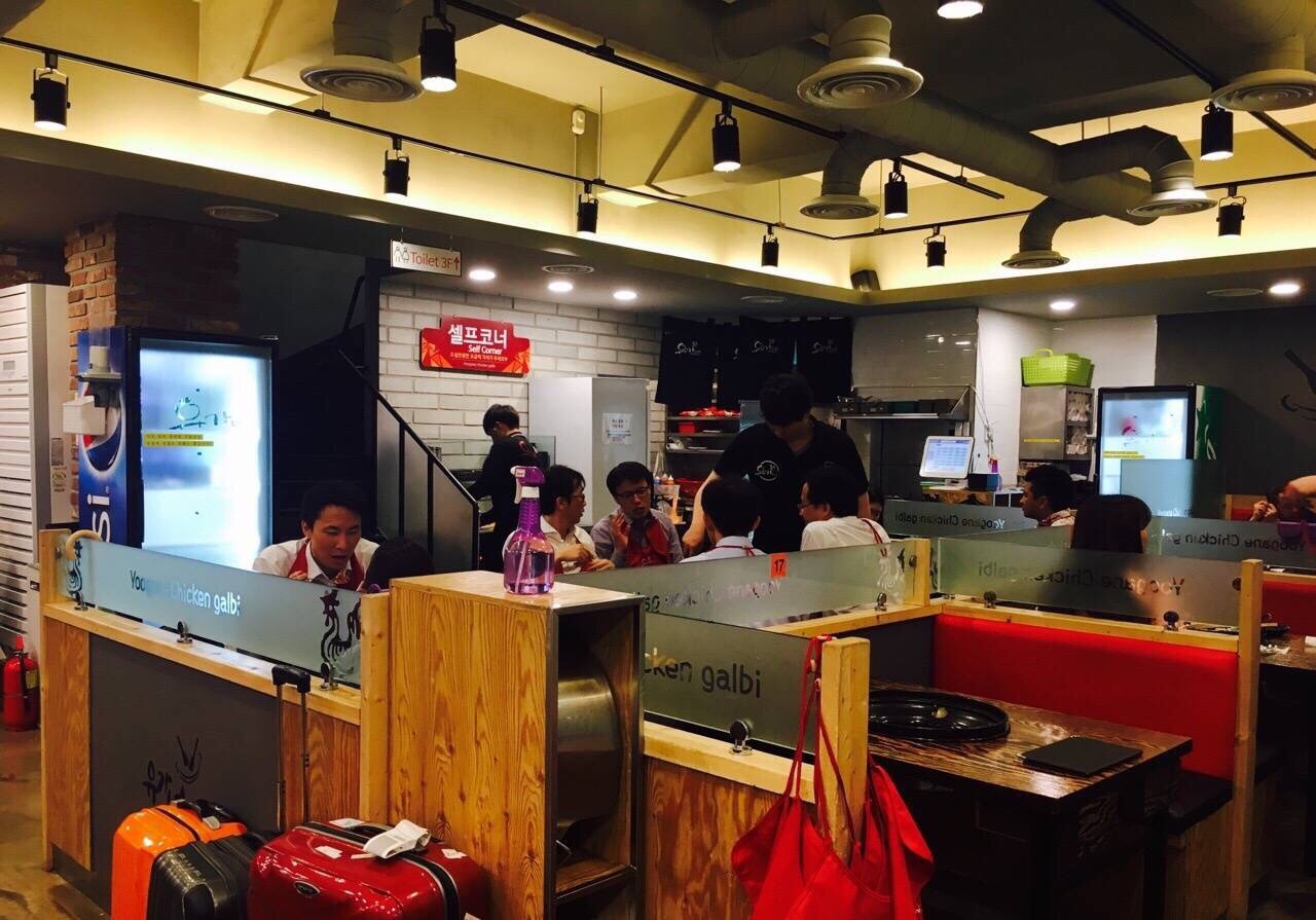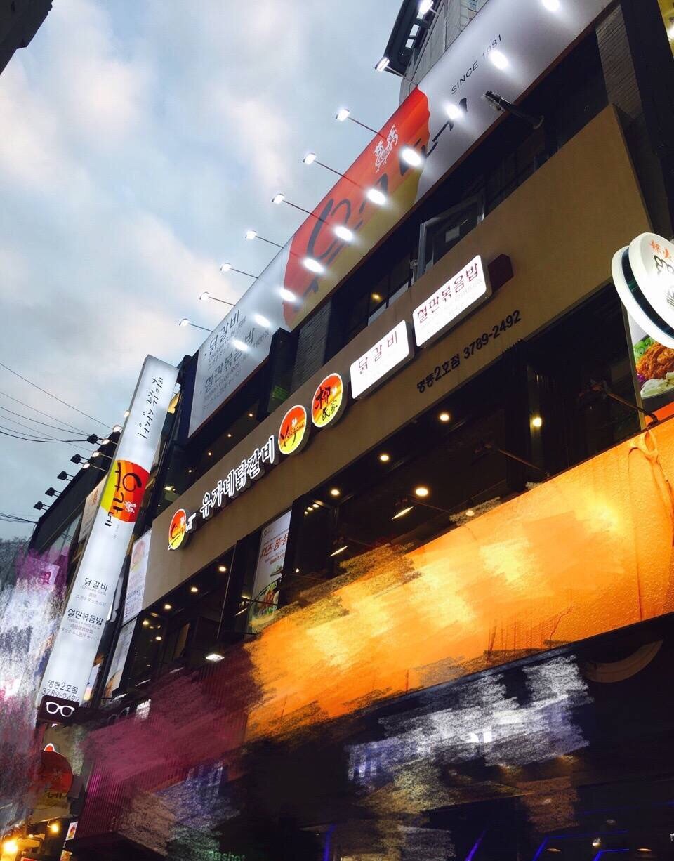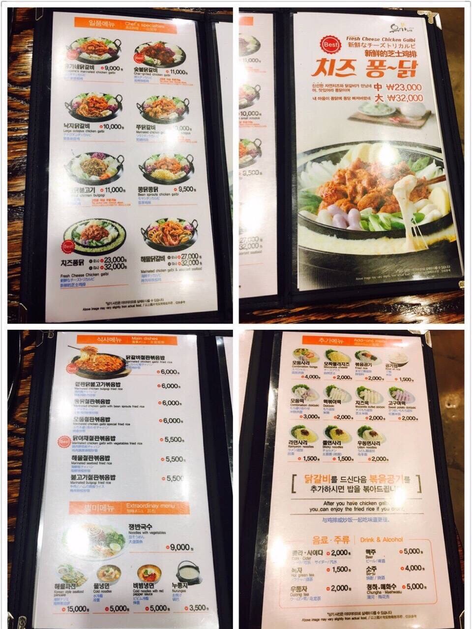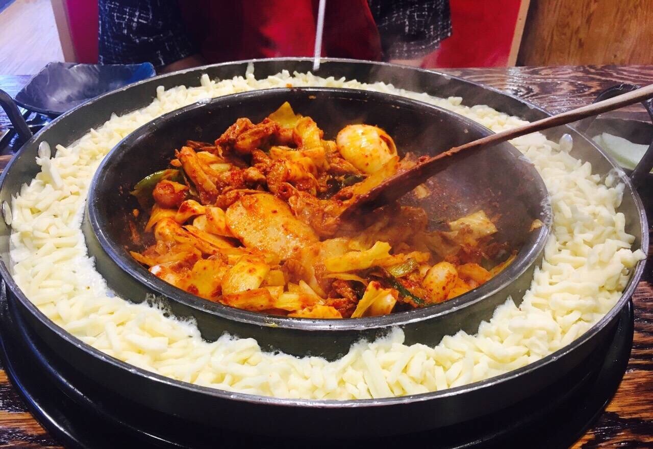 在明洞逛街,除了购物,别忘了美食~这是一家始于1981年的传统韩式炒鸡排专营店#,位置很好找哒,在楼上,有个很通透的大窗户可以看到明洞小巷子的景色。 装修风格很人性化,小菜什么的是自助。各个国家的游客都有,应该都是慕名而来的吧,还有拉着行李箱过来吃饭的吼吼~~ 点了最特色的芝士炒鸡排,铁锅的中间是炒鸡,周围散着一圈浓浓的芝士,随着温度的升高,看着芝士一点点的咕嘟咕嘟的融化,鸡排裹着芝士,非常棒!微辣口味,刚刚好~我们还加了一份很有嚼劲的面,混合着炒鸡排的汤汁,面更有味道~~ 哦对,如果吃炒鸡排,是一定要加一分米饭才算完整的韩式传统吃法~米饭、海苔还有鸡肉芝士混合在一起,味道好极啦~~ 有中文菜单,服务员清一色小帅哥,非常亲切可爱滴!
