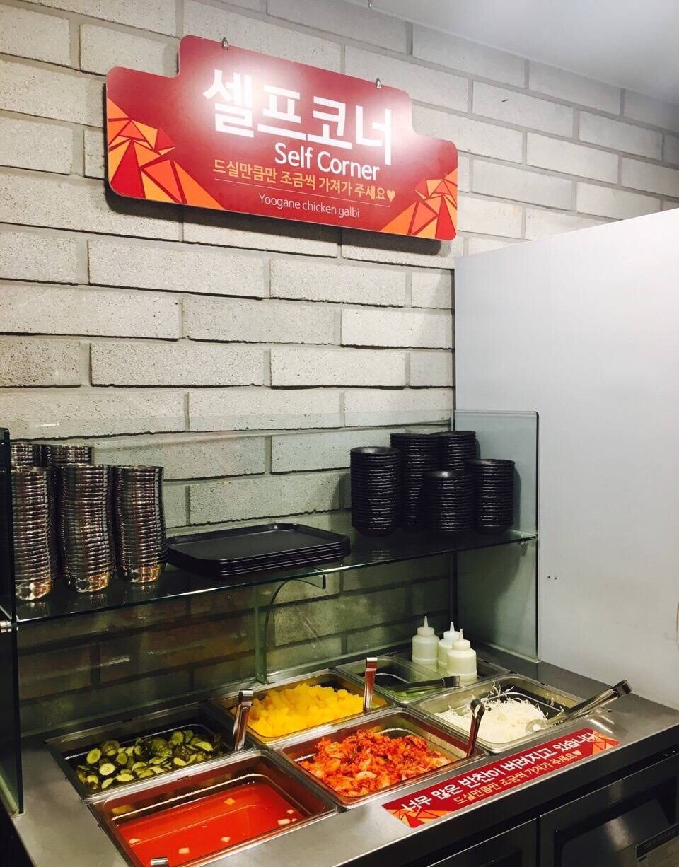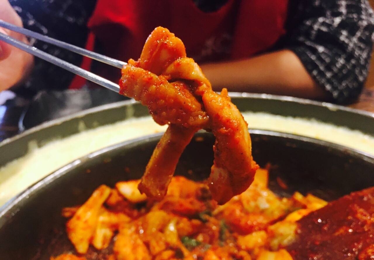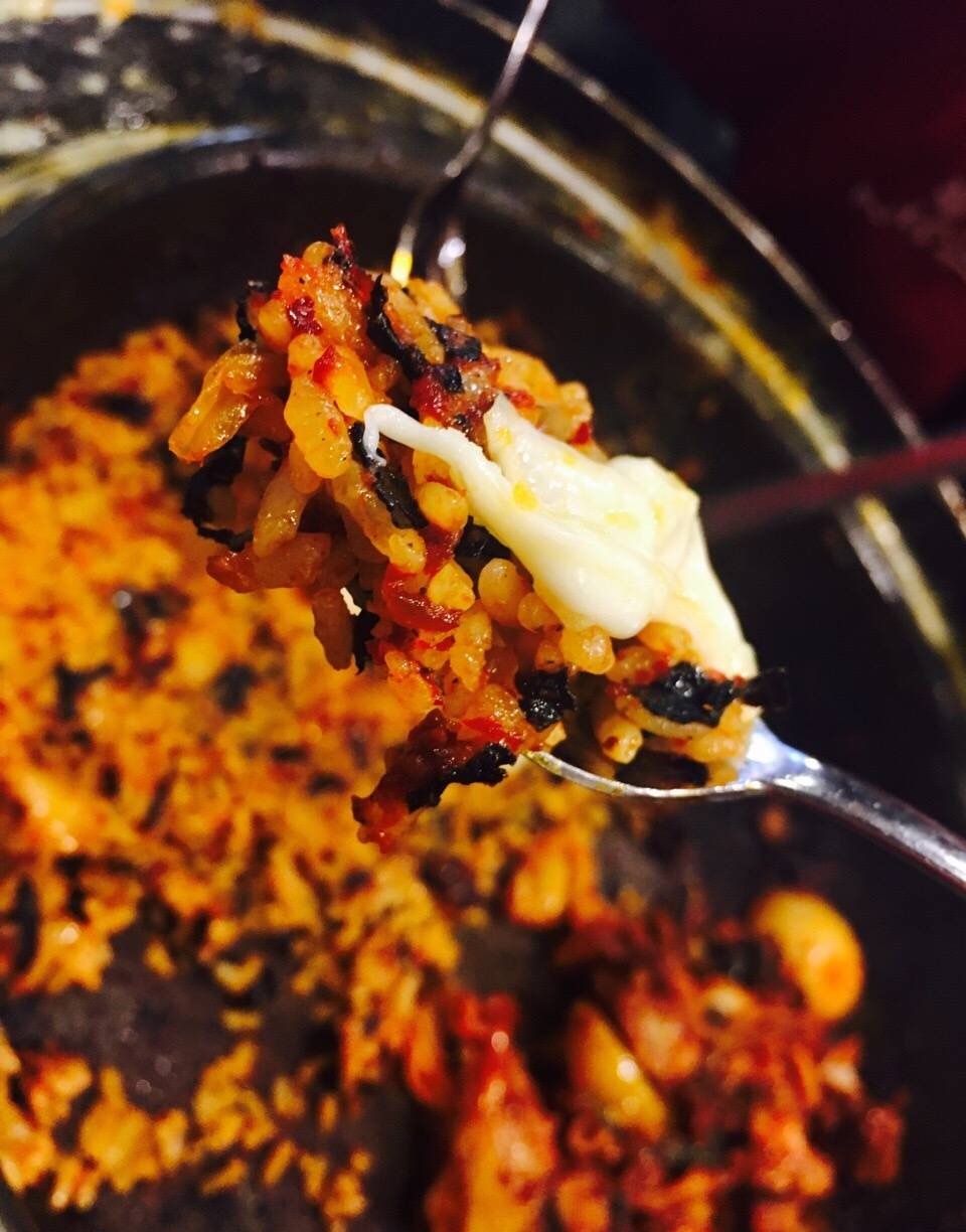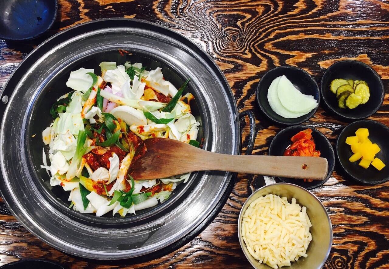 在明洞逛街,除了购物,别忘了美食~这是一家始于1981年的传统韩式炒鸡排专营店#,位置很好找哒,在楼上,有个很通透的大窗户可以看到明洞小巷子的景色。 装修风格很人性化,小菜什么的是自助。各个国家的游客都有,应该都是慕名而来的吧,还有拉着行李箱过来吃饭的吼吼~~ 点了最特色的芝士炒鸡排,铁锅的中间是炒鸡,周围散着一圈浓浓的芝士,随着温度的升高,看着芝士一点点的咕嘟咕嘟的融化,鸡排裹着芝士,非常棒!微辣口味,刚刚好~我们还加了一份很有嚼劲的面,混合着炒鸡排的汤汁,面更有味道~~ 哦对,如果吃炒鸡排,是一定要加一分米饭才算完整的韩式传统吃法~米饭、海苔还有鸡肉芝士混合在一起,味道好极啦~~ 有中文菜单,服务员清一色小帅哥,非常亲切可爱滴!