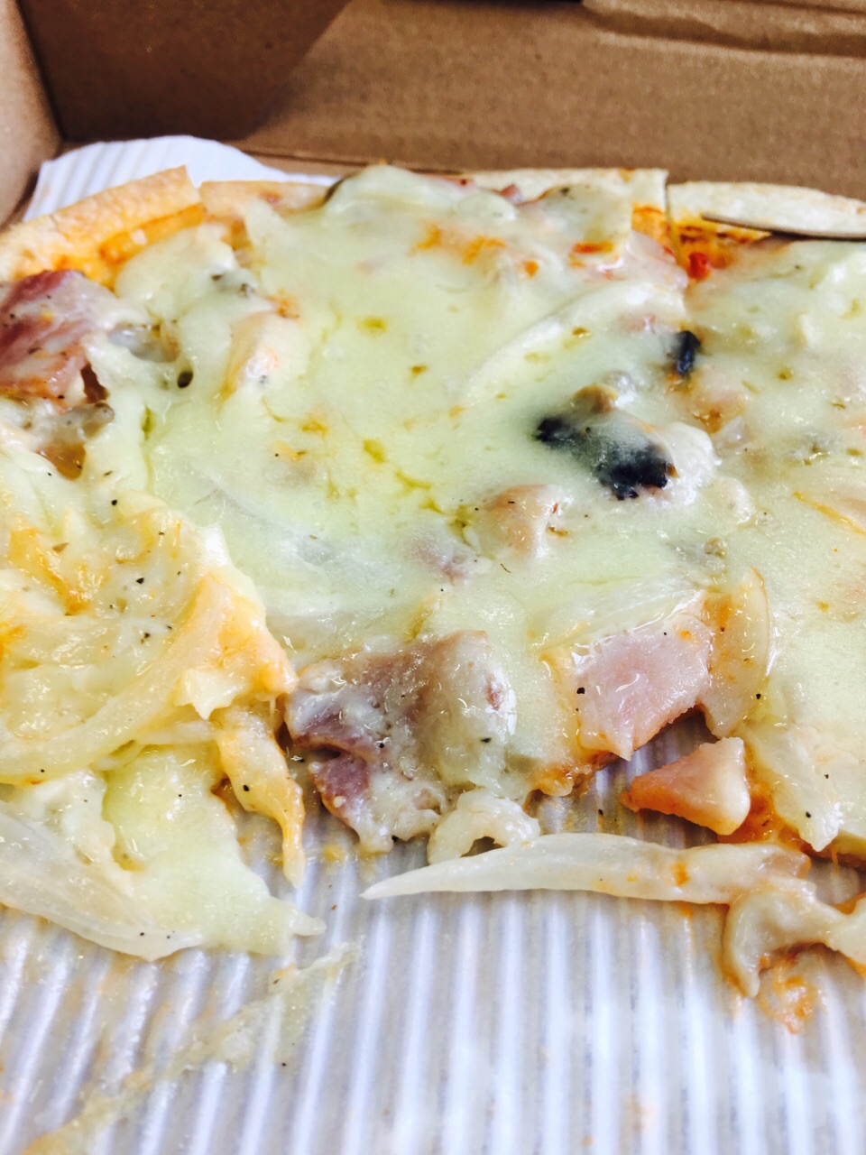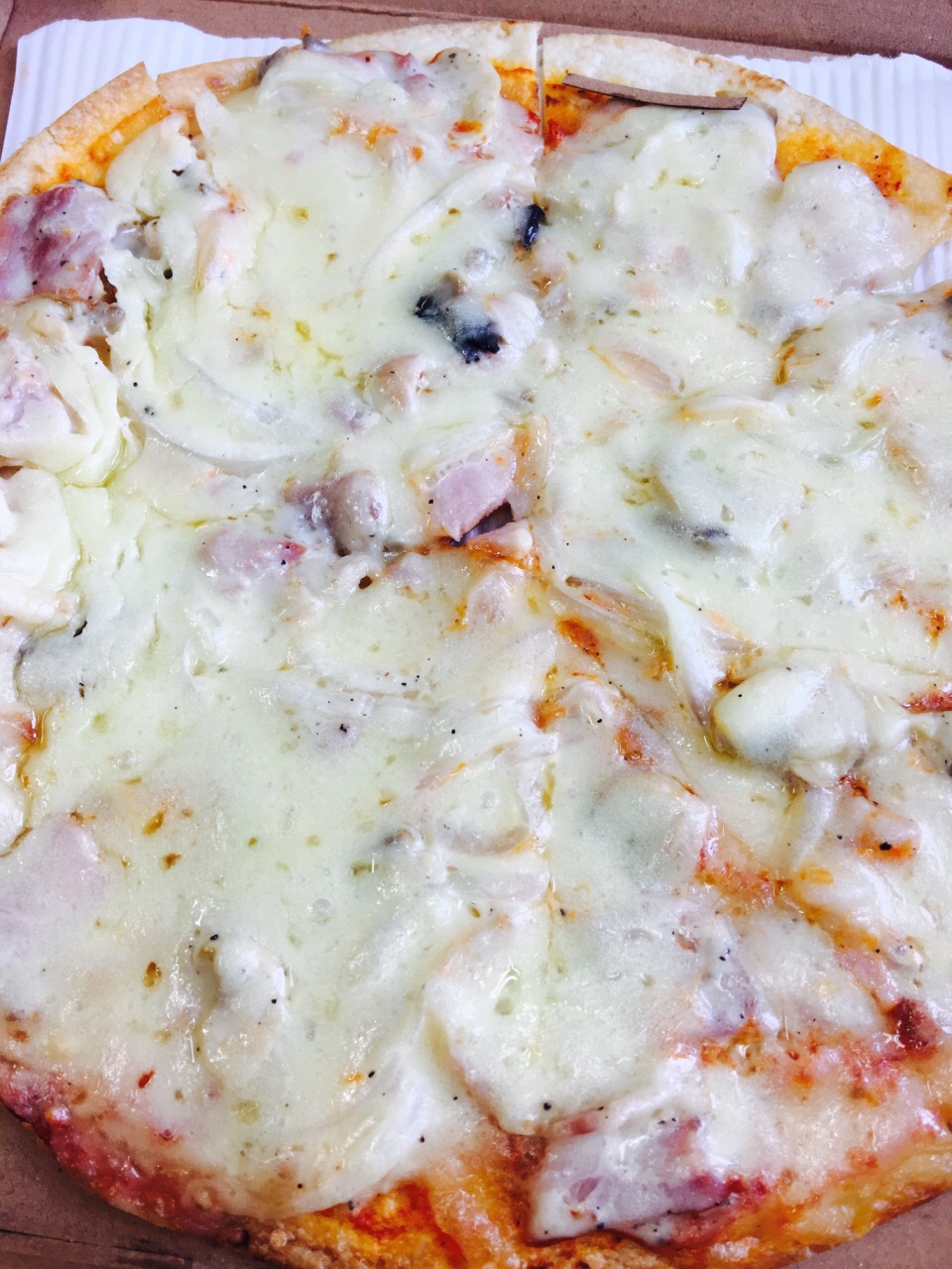 朋友安利的一家店,离公司不远,中午就叫了披萨外卖,喜欢的就是薄饼披萨,因为味道真的不错,饼底薄脆,用料也实足!芝士超级多!