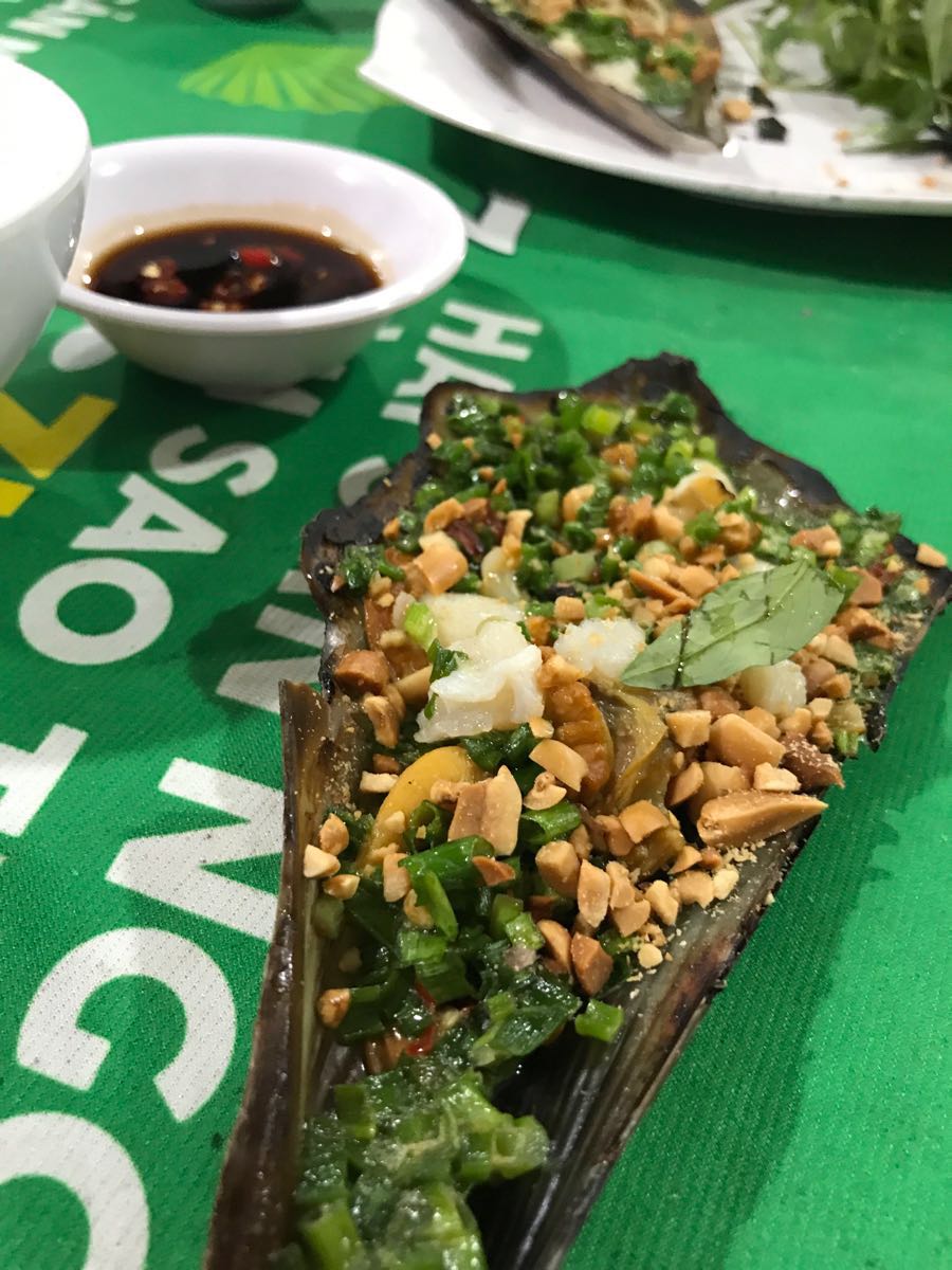 跟着Google地图自己走来的!还未过马路,就被对面店家拉客的拦住,意志坚定!过马路终于来到了传说中的海鲜排档 环境不说了,排档的环境! 海鲜新鲜啊!点了龙虾,用越南这里专门的煸炒,酸酸甜甜,好多蒜泥,特别入味!带子用烧烤的,好多花生碎葱花,不错哦!皮皮虾,这个季节不建议吃了…那个贝类,不知道具体名字,肥肥香香的好吃,在这里,不顾会吃相,一股脑儿端起贝壳跐溜一下一扫而尽!不过瘾,打算着明晚再去