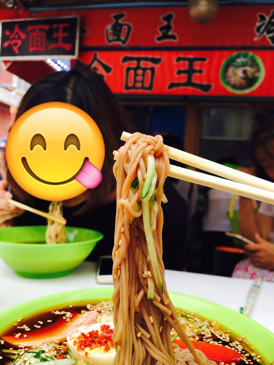 艾玛~一打开这家店看刚好一年前也是六月底去台东看排队就没吃。。 这回补上补上~ 在长兴路松和路一号对面~ 每次来都是大长队~ 尤其天热来一碗冷面~ 也是排了二十分钟?~ 要了个荞麦面的~ 朝鲜冷面就是酸酸酸甜口~ 黄瓜丝泡菜~西红柿鸡蛋~ 本来应该是牛肉片。。 不过低配版本就是午餐肉片啦~ 荞麦面比较q~ 上面撒的满满的芝麻~特别香~ 我们吃完月光传奇才来的。。 所以有点吃不动了。。 应该饭前先来一碗开开胃的哈哈哈哈!~ 有桌椅座位~ 服务生收拾的特别及时~赞赞的~
