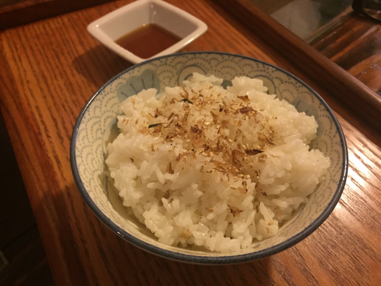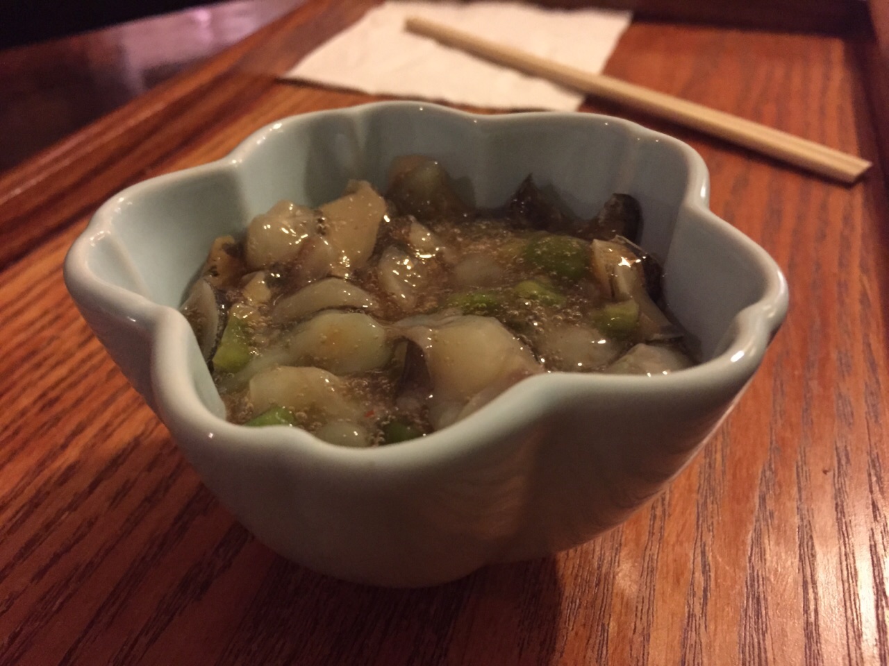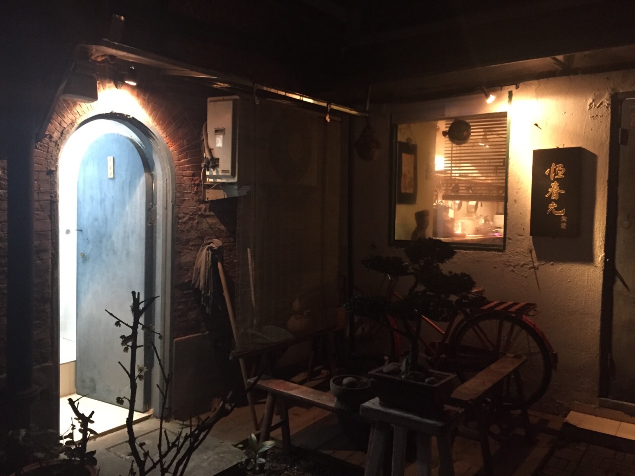 一家只能容纳7人的小食堂 接待、点餐、烹饪、端盘、收银全由老板一人亲力亲为 它或许是最接近日剧“深夜食堂”的模板 坐标→常熟路站一号出口 出口往后 走向第一条弄堂 铁门外是一枚木质的极小的logo标牌 很容易错过 攻略:每晚六点准时营业 周日休息 铁门无需密码 自行推入 去的时候尚早 2.14是周日 恰逢情人节 门外隐约看到老板忙碌的身影 抱着侥幸心理 电联了老板 得到的答案是18点准时营业 外面晃了一圈 提早五分钟前往 os会不会包场 谁料门口怡然站着五个人 连同我们正好七人 18点整 老板开门营业 依照秩序一个一个入内 我们被安排在最靠门的两人座 放下包和衣服 细细打量整店 长廊型木桌 一排七人位 餐桌前用布帘遮掩的是老板的烹饪区 正对我座的是一个水槽 抬头就能看到墙角的斑斑劣迹 昏暗的环境 只有中间挂着一顶灯泡 后方的墙上贴满了日本海报 推门而出 是一小块花园(花花草草不多 木匠的工具不少) 还有间独立卫生室 大隐于市 一页菜单 小菜、炖煮、烤物、盖饭、面食 有些食材会提前告知不供应 每位客人前 安置了一长方木盒 简单的一次性筷子&纸巾 『芥末小菜』¥28 章鱼&海螺 章鱼片&螺片结合 芥末略冲鼻 偏好海螺 『清酒煮蛤蜊』¥48 每日限定 也是该店招牌 会附上装壳盘一个 细节处到位 清酒的味道并不重 每颗蛤蜊都包含生命似得 『照烧鸡肉』¥9/串 酱汁裹得很厚 直黏嘴 让人错觉的以为胶原蛋白饱和 『烤鲭花鱼』¥33 紫菜点缀 鱼肉鲜嫩 事先腌制后再烤 口味丰腴 『鳗鱼饭』¥68 因鳗鱼饭而起 决定的情人节晚餐 选取鳗鱼中后段 搭配鸡蛋 紫菜&米饭 黄金蛋液覆盖于米饭上 鳗鱼的调味略微清淡 『米饭』¥10 另加黄油+5 普通的一碗米饭 湿软黏稠 摄入黄油后 一切变得妙不可言 柔软、香喷喷的呈现眼前 佐以鲜酱油 一碗怎么够 寡言少语 为人低调的老板 独自经营的日料小店 不管好吃与否 用心烹饪的心值得肯定
