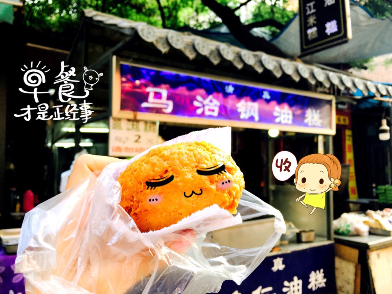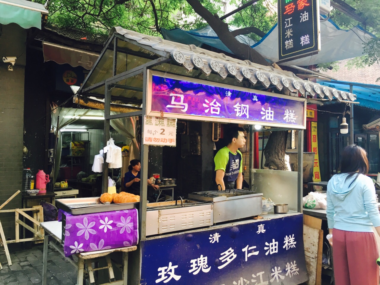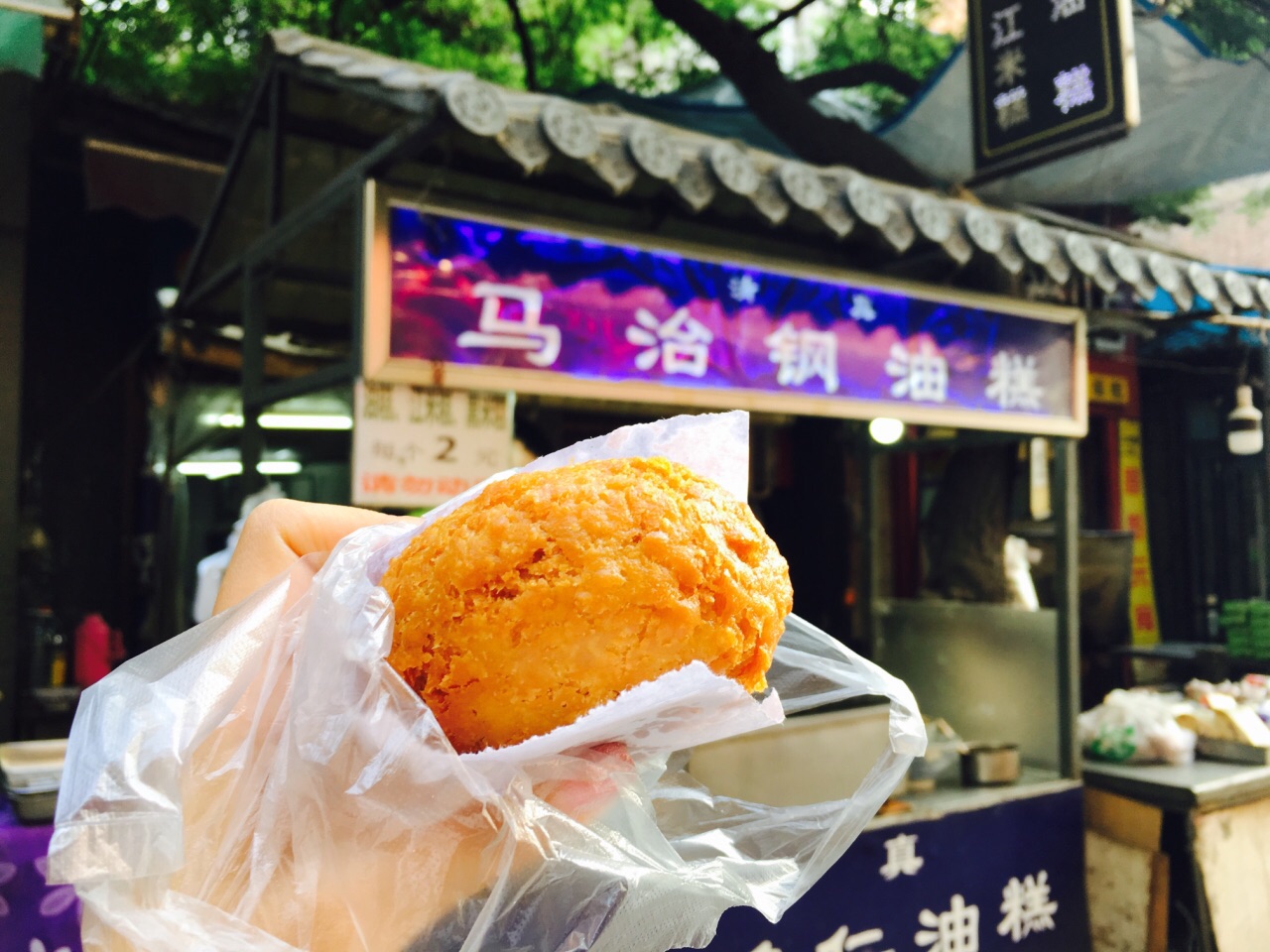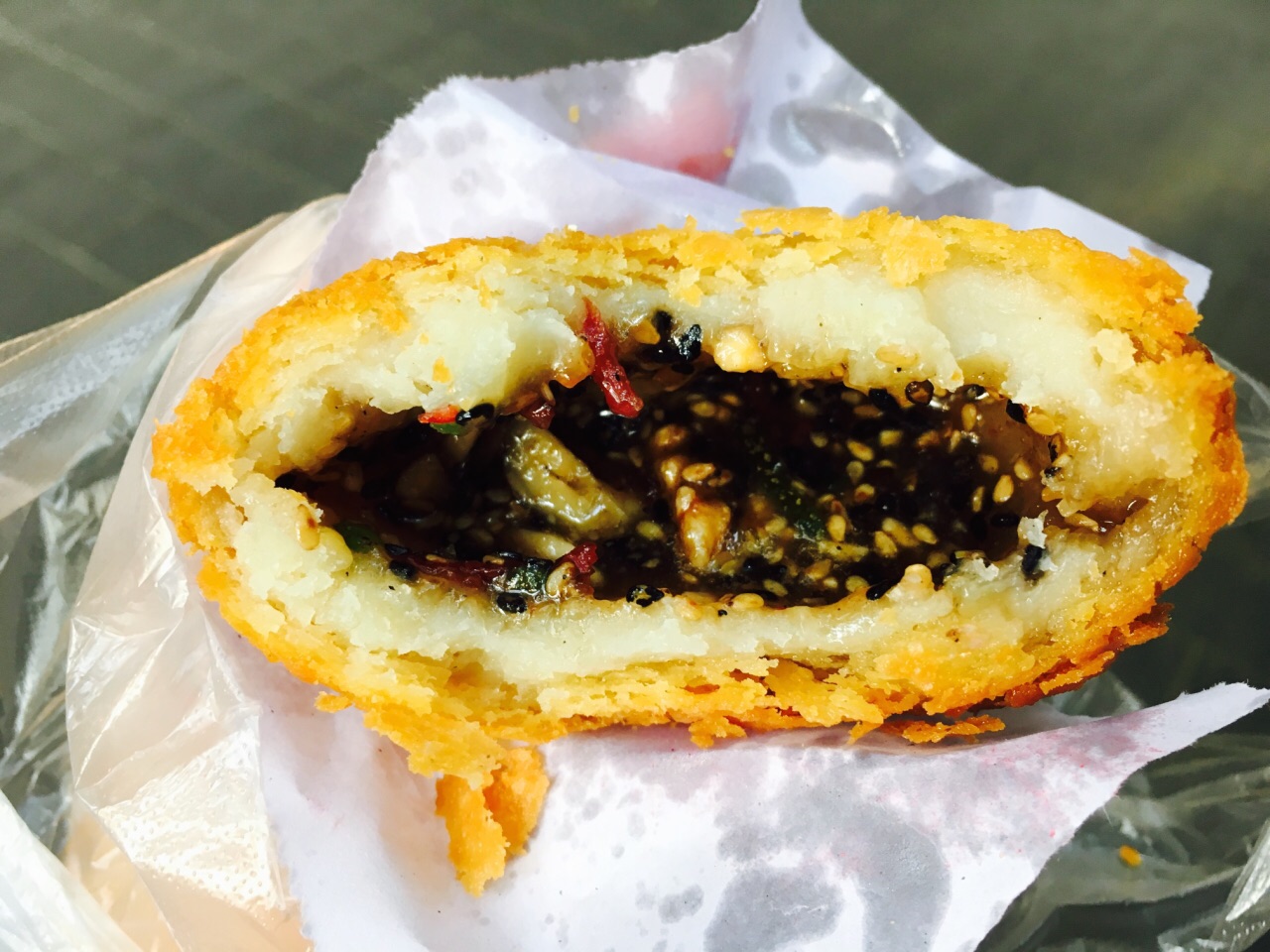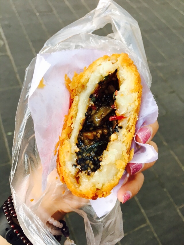 西安之旅 (因为一颗吃货的心)起得太早... 小本本上记录的想去的店都没开始营业, 走了一圈看到这家开啦~ 想要个黑米糕的, 老板说只有这一种...好嘛.... 两元一个~其实还蛮大个的... 五仁儿馅儿~能看到中间一块儿核桃仁儿~ 甜甜蜜蜜的味道~ 刚炸出来没多久,小心馅儿很烫呀~ 吃完一整个其实有点甜腻... 然而吃完我就继续向甑糕出发了 【吃货的执着...】 回想起来也是有点齁