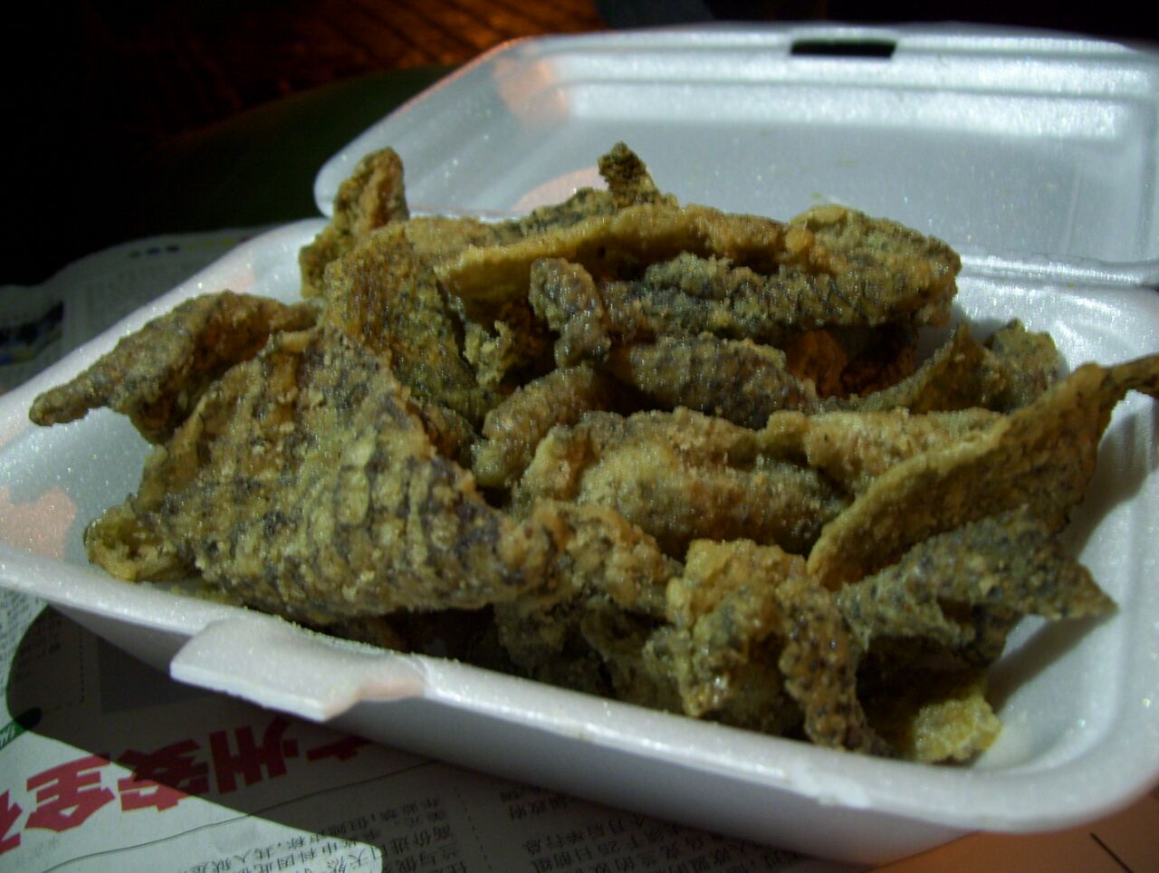77觉得脆的蛮好吃的 没想到居然有哎!现炸的新鲜 鱼皮就只有一点盐巴的味道