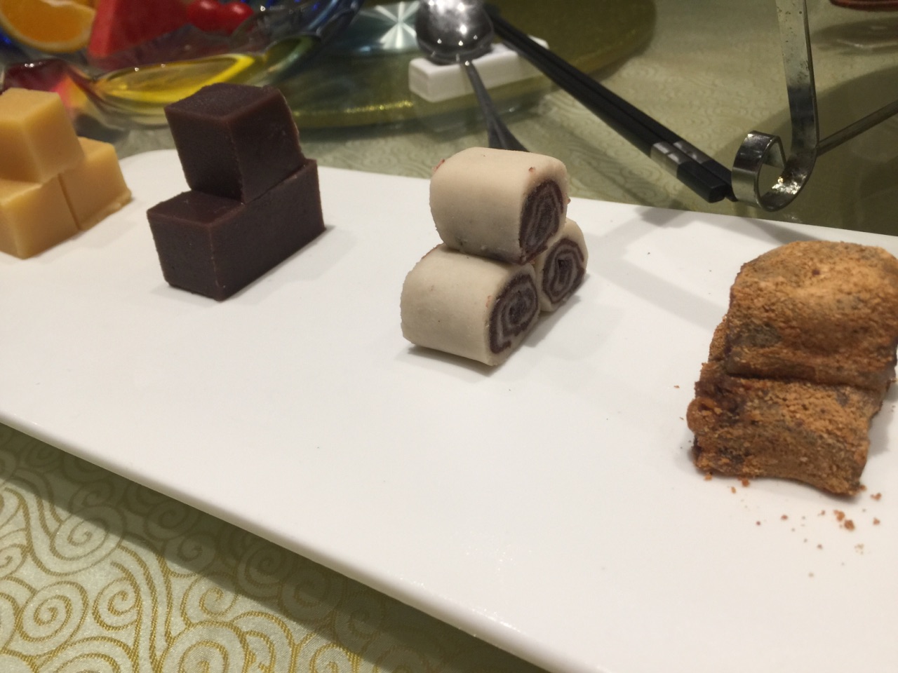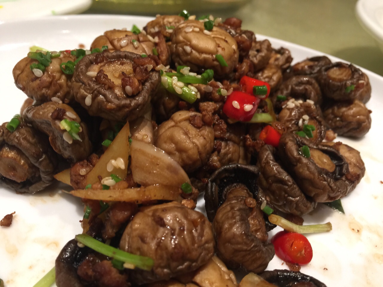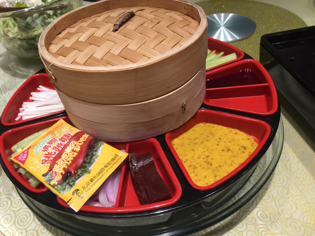 和几十年未见的老同学聚会,真心来自五湖四海,世界各地,所以那天主要忙着聊天,菜的照片拍的少,吃的也少! 反正在聊天百忙中记住的菜一定是最好的。 【环境】10分,现在的餐厅味道已经变的次要,环境最重要。这里就是符合这个条件。 【芥末鸭掌】10分 口感很好,有芥末感但有不刺激口腔,脆脆的 【泰式虾球】8分,有点过分酸,虾的味道一点没吃出来 【干煸口蘑】10分:在我面前,一直我在吃,干煸的很入味 【义和烤鸭】8分,让我记忆深刻的不是味道,是腔调,分三道吃,每切一层都放在加温的磁盘上。第一道,皮夹话梅丝,第2道,肉加皮沾芥末酱吃;第三道包饼京葱吃! 【椒盐鸭架】剩余的鸭架就椒盐加工吃 【北京印象点心】8分 几种点心融合,可以吃到3种口味