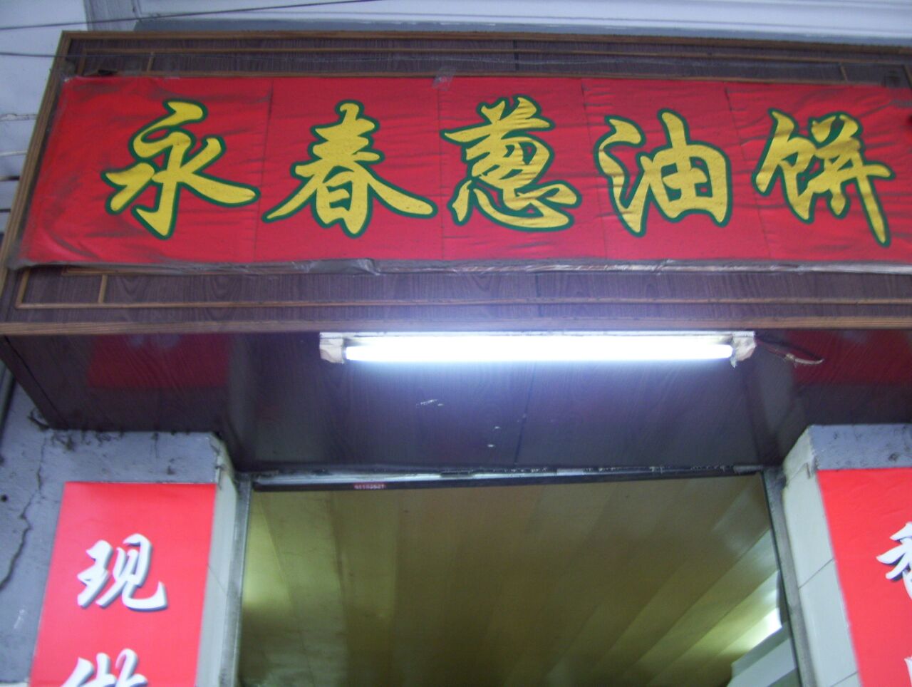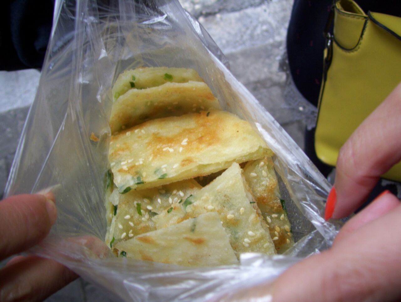 好小的一家门面 阿拉过去的时候没看到葱油饼 问了一下说在做 招牌是葱油饼嘛 个么阿拉肯定有耐心等的~ 土家酱香饼 在我们等葱油饼的时候 广州的小伙伴买了另外一个土家酱香饼 阿拉尝了一块 口味比较咸 还带有微微的辣 味道蛮好次的呀 芝麻葱油饼 葱油饼的价格略低些 不过因为阿拉先吃了重口味的酱香饼 这葱油饼瞬间显得木有味道了…….也或者阿拉本来就好重口味吧~