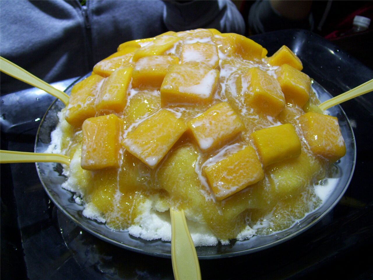 同行的小伙伴没有甜品收尾不行 这是今天最后一家店了 一楼下面堆放了好多框 看到有不少芒果 就这么赤裸裸的放着 用餐是在二楼的 上去只有一桌客人 点单有专门的窗口 做完会送过来 这家店的前身叫斯利美 不过店里有解释跟我们现在看到的斯利美没有任何关系 只是因为这个品牌被先注册掉了 然后他们家改了现在的这个名字 超级芒果冰 吃过上海斯利美的芒果冰 映像不是那么的好 这家的好吃多了 主要是下面的牛奶冰能吃的出奶味呀!表层的芒果切得也好大颗!