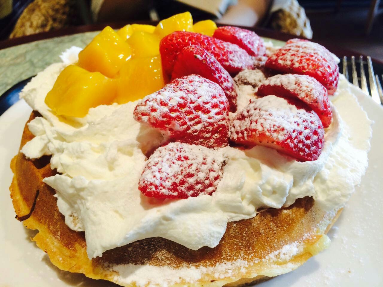 ...道的还可以吧,一个华夫饼大概在50块钱,分量也还不错,就是如果让他加上奶油的话,会稍微有一点腻进来休息的,然后华夫饼味道很多,我觉得枫糖味道的还可以吧,一个华夫饼大概在50块钱,分量也还不错,就是如果让他加上奶油的话,会稍微有一点腻。