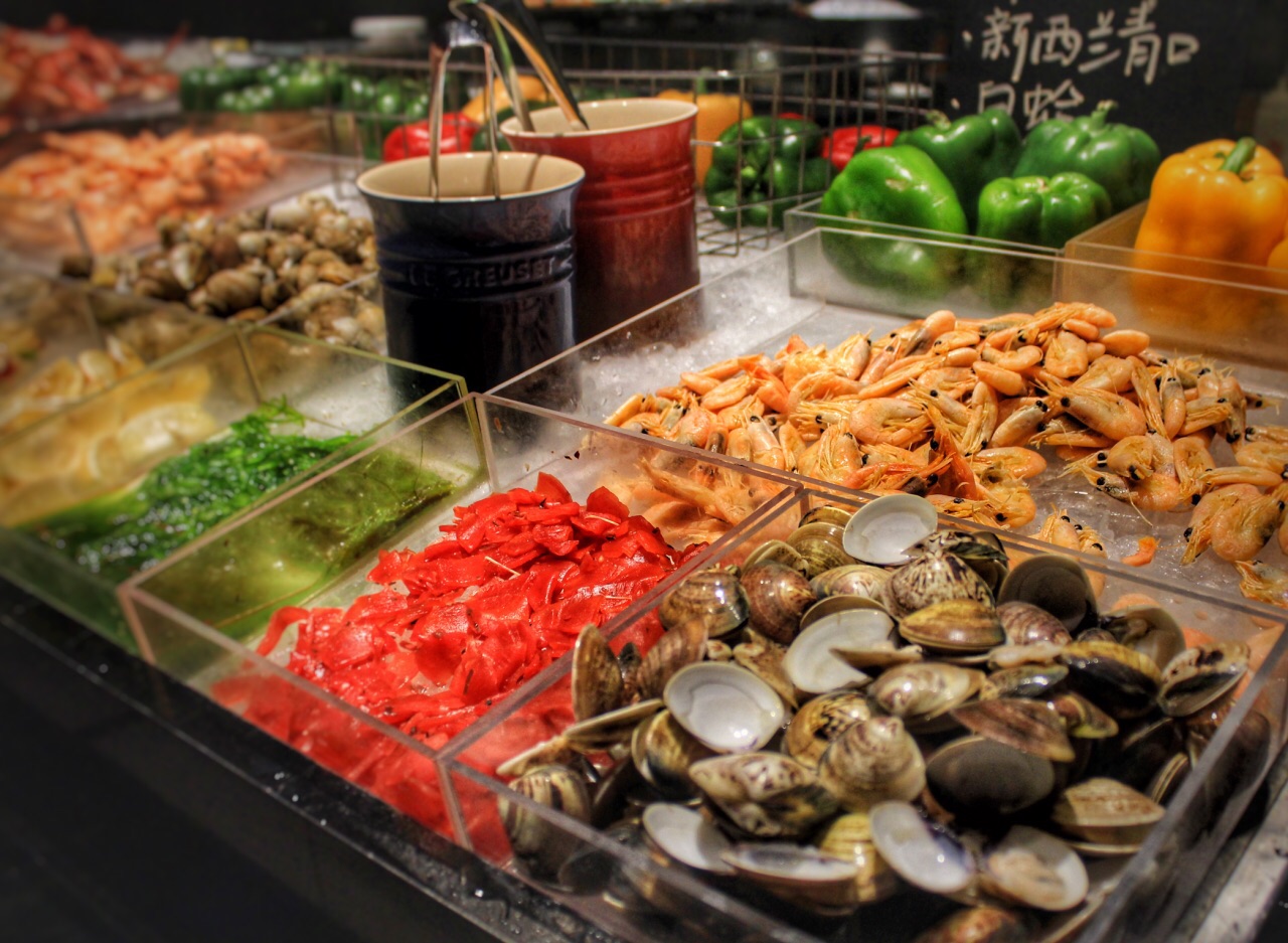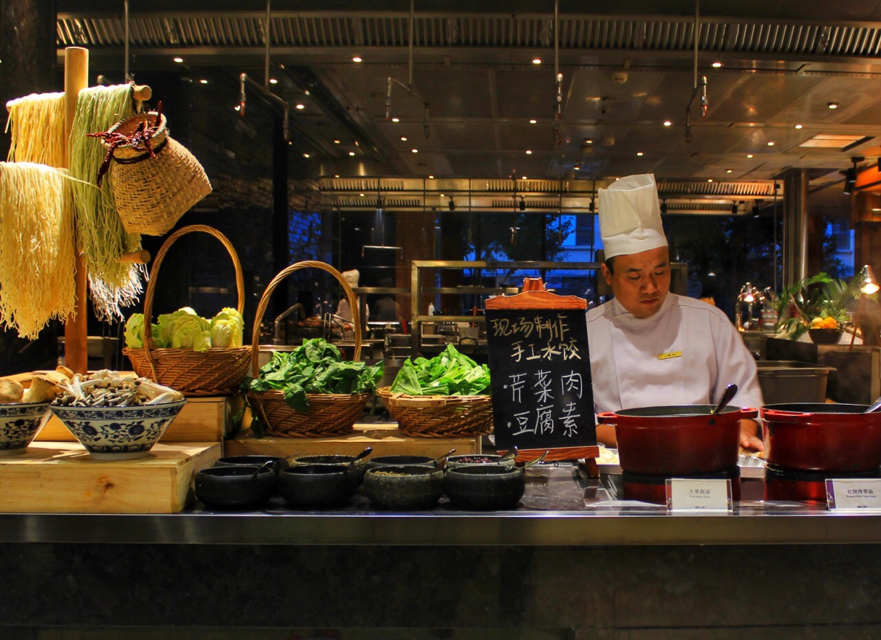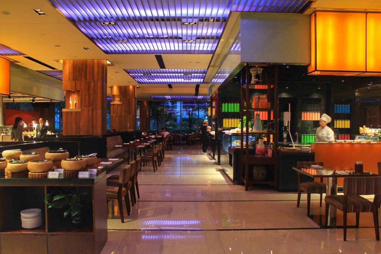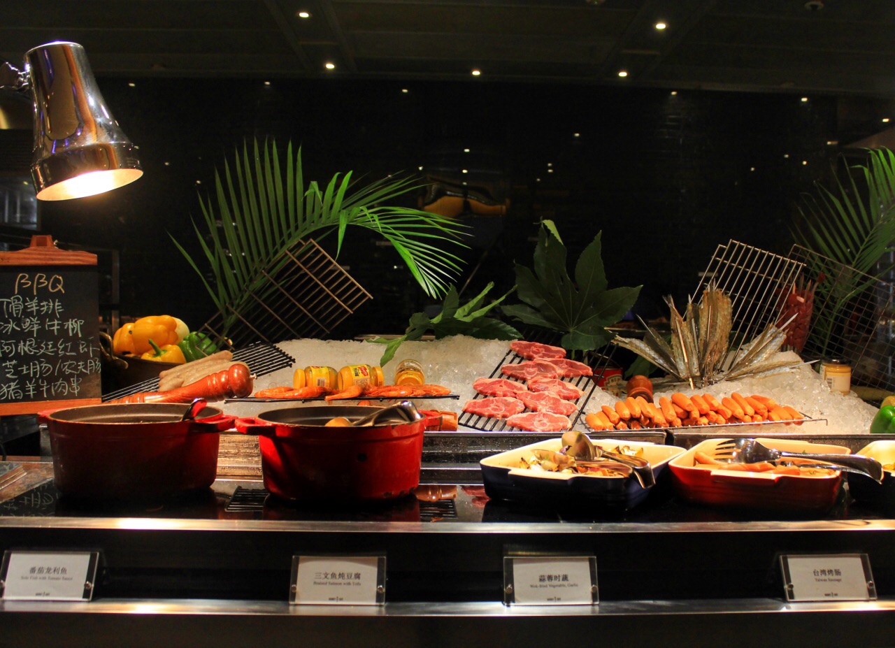 一楼全天候营业的咖啡厅,自助晚餐丰盛可口。琳琅满目的海鲜,现做的面点水饺,蔬菜沙拉水果种类丰富果香四溢,中式热菜、日式刺身寿司、西式烘焙每一个餐台都充裕而满足,口味更是令人信服。最具特色的还是甜品区,各式各样的小甜点已经讨喜的不得了,竟然还可以自己彩绘图案,哪怕已经酒足饭饱,看到这甜品精致的模样,不吃掉都会觉得亏死。 环顾四周,装修风格色调偏暗一些,微暗的灯光氛围烘托出了一种雅致而浪漫的氛围。在这里享用美食,其中一个特色就是可以亲眼看见美食是怎么来的。全开放的厨房,所有菜品,都是厨师现场在这里做出来的!每道菜品都十分精致,看不到粗糙的摆盘,更像是一件件的小艺术品,这里明显加大了中餐部分的菜品数量,甚至还有接地气的炉火烤串,味道极好。来这里开心地享受世界各地的美食,每一种味道都是大厨们满满的创意和诚意。