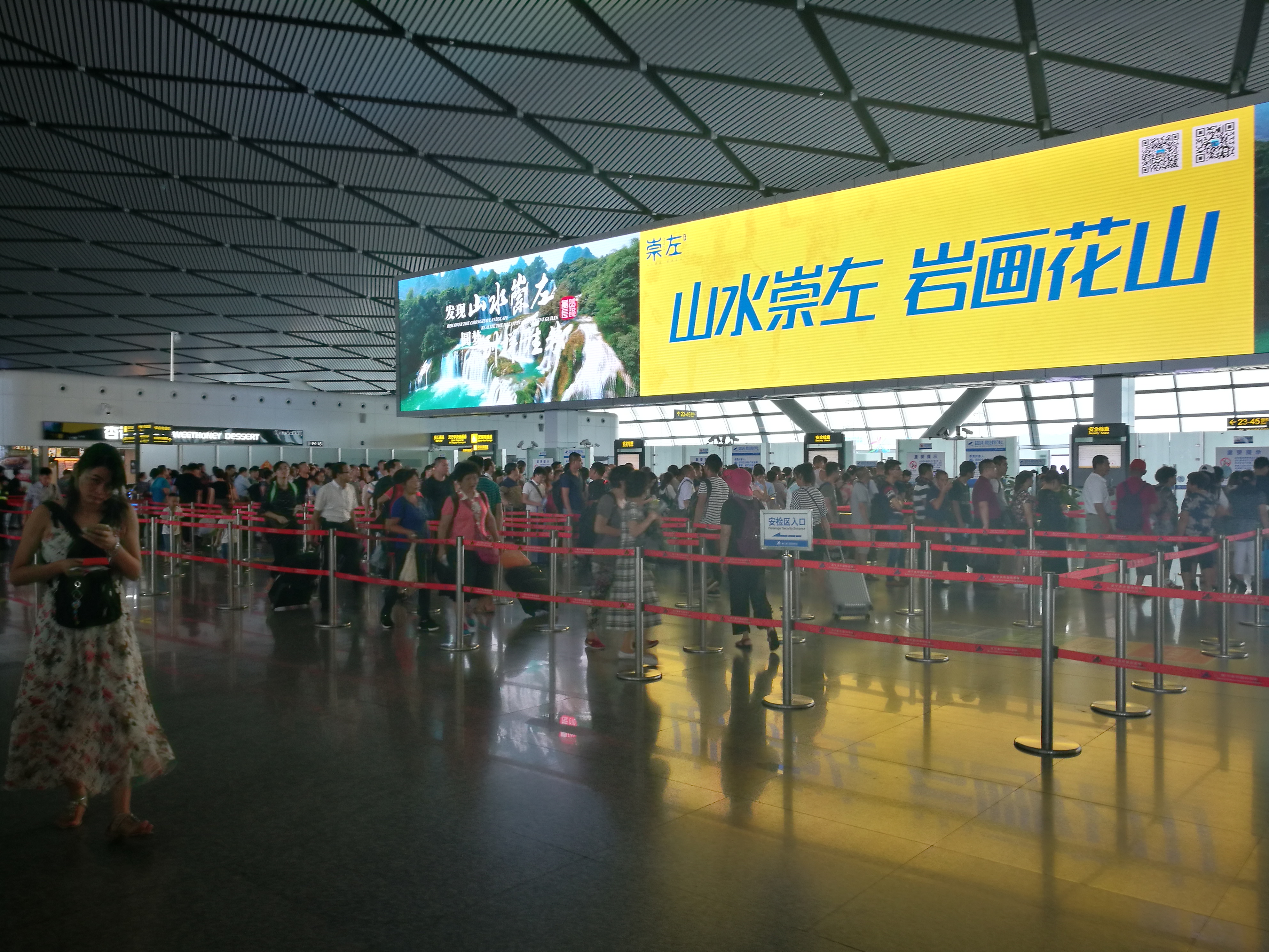 尤其是过安检的通道实在有些少,排队的人比较长,所以必须得提前足够的时间才可以T2航站楼的旅客很多,但候机厅的面积却不是太大,显得很拥挤。尤其是过安检的通道实在有些少,排队的人比较长,所以必须得提前足够的时间才可以。