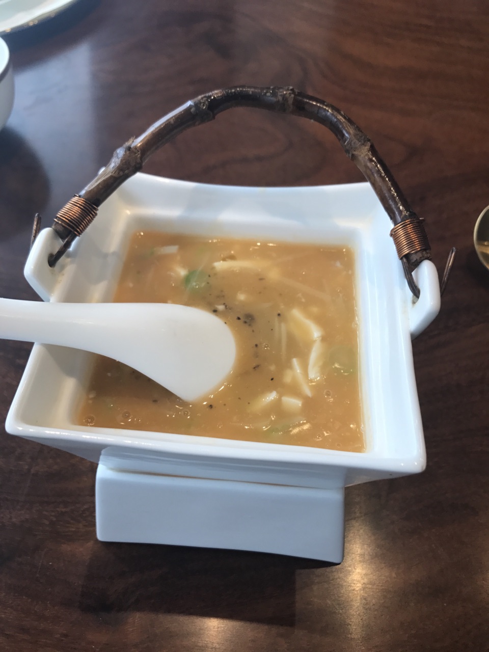 午饭过来试吃,在别墅群里,环境很不错,很高档,宴请朋友高端之选,这里服务不错,会很细心的记录个人口味爱好。黑毛猪烧肉鲍鱼配南瓜不错,但我绝对还不够香,要是在熬久点,肉在肥点会更好。龙虾汤汁很好,微辣很开胃。龙虾汤黑松露豆腐羹汤我很喜欢,很好喝。上汤煮时蔬也弄的好,上汤味道刚好,腊味炒饭每粒饭粒软硬度都很适中,水份刚好,吃起来不会觉得干,腊肠很提味,吃的很满足, 下次带朋友来。