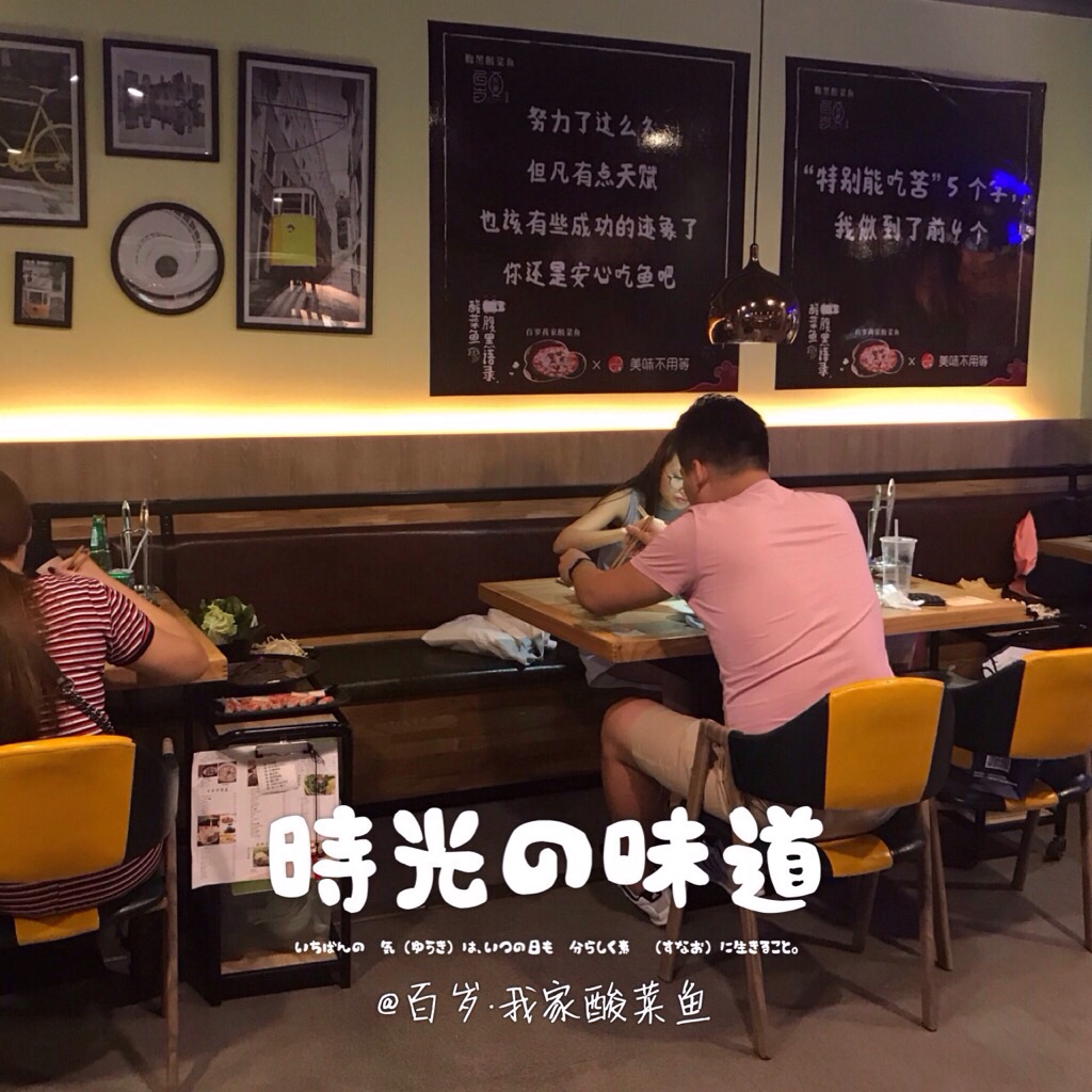 百岁、百素傻傻分不清,酸菜鱼真的是遍布大上海的节奏了!还是忠于原味喜欢百岁酸菜鱼啦! 哈哈哈!餐厅里这么多负能量真的好吗?“只要是石头,到哪都不会发光的!” 地段不错,就在曲阳家乐福楼上,买完东西来吃大餐,也是so方便! “努力过了那么久,但凡有点天赋,也该有些成功的迹象了,你还是安心吃鱼吧!”这大概就是所谓的丧文化入侵吧! 鱼来之前先来一份绿茶饼,这个百素没有呢,超喜欢! 超美的一锅鱼,看着就很诱人,活鱼现杀不是盖的! 前几年流行沸腾鱼,这几年流行酸菜鱼,我就跟着吃吃吃就好啦!鱼片真的很嫩,以及超爱酸萝卜和宽粉! 吃完鱼秒变火锅汤底涮菜吃,喜欢芝士年糕诶! 最后再来一份红糖糍粑,甜点吃了个满足,哈哈哈!