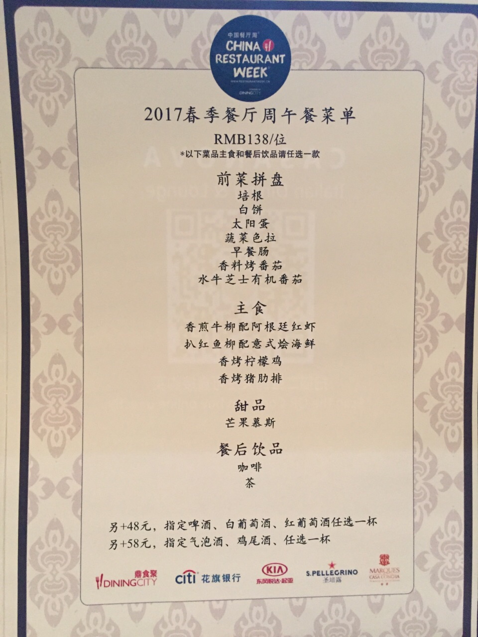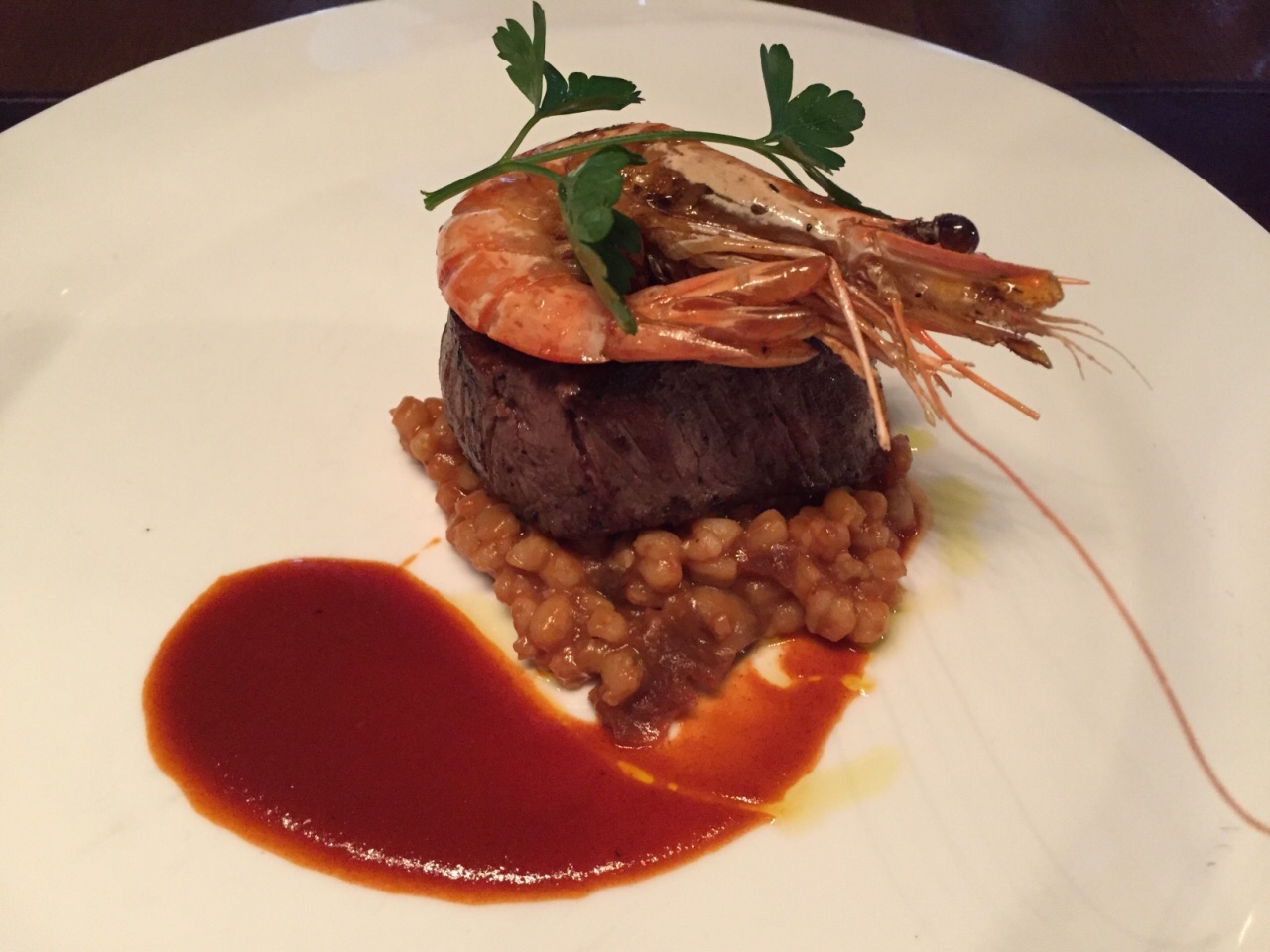 这家在外滩一排店里,现在算是很亲民的价格了。看中了他们家的地理位置,春季的餐厅周就预定了这里。 前菜:蔬菜色拉,培根,太阳蛋,香肠等。前菜该有的都有,只是内容上没有什么值得惊艳。 主菜:我点的是香煎牛柳配阿根廷红虾,要的5分熟,牛排味道还行,下面垫的黄豆感觉没看到过,有点变扭。 香烤猪肋排,除了肉,还有甜椒等等。猪肋排满厚实,差不多3根大骨头,表皮有一层酱汁,微甜的口感。 甜品是芒果慕斯,上面插了块巧克力,中规中矩。 最最表扬的是他们家的风景,从旁边走出去就可以看到外滩对岸的陆家嘴美景。真的是令人流连忘返。 在他们家吃饭可以免费停2小时,我是一开始不知道,停旁边的停车场了。