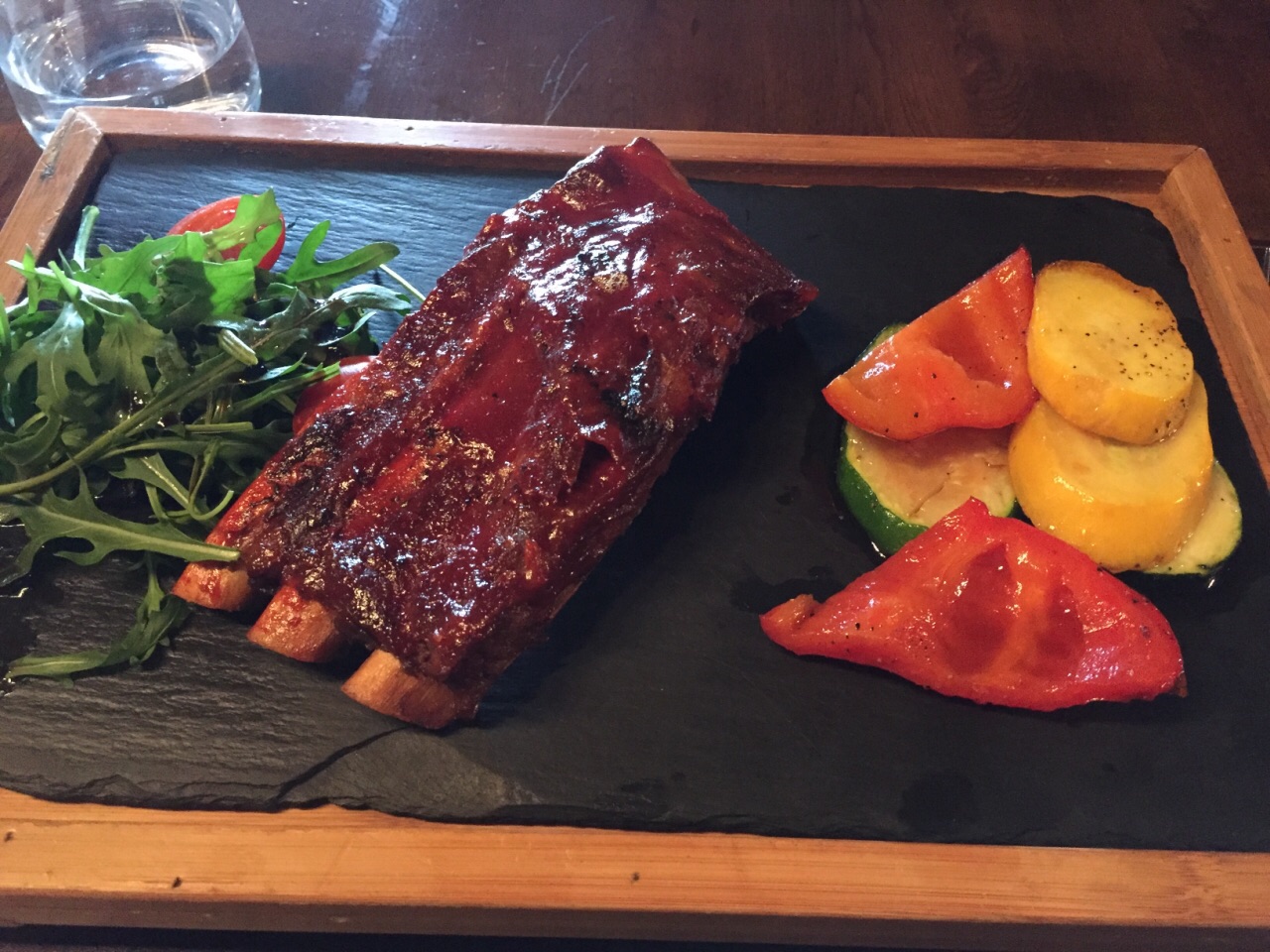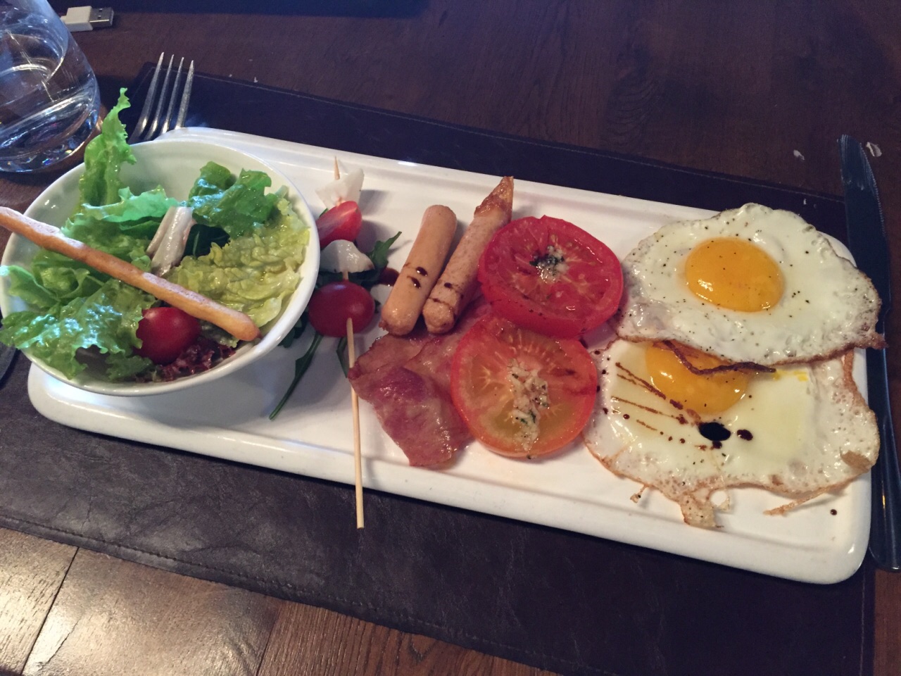 猪肋排满厚实,差不多3根大骨头,表皮有一层酱汁,微甜的口感。 前菜:蔬菜色拉,培根,太阳蛋,香肠等