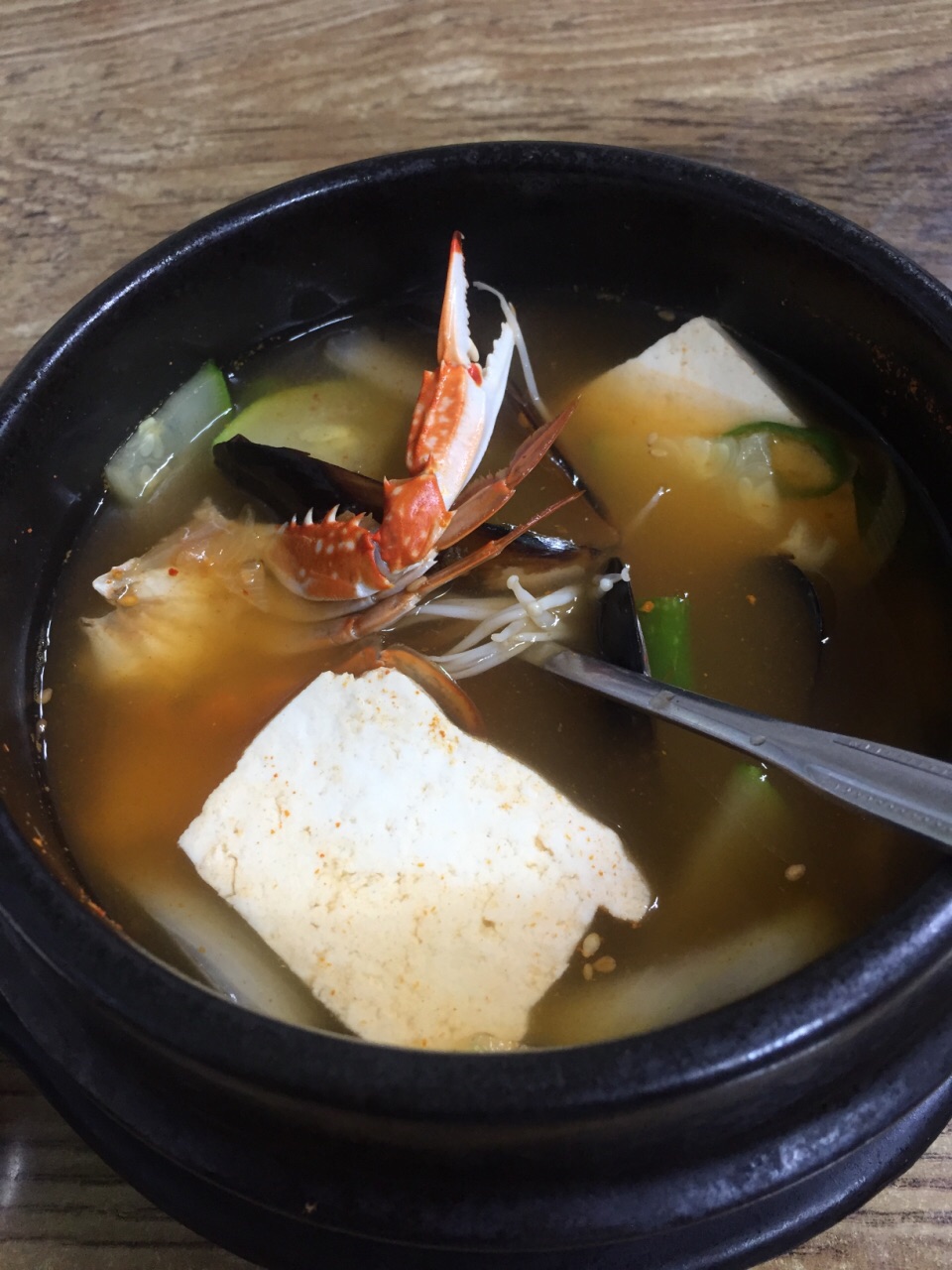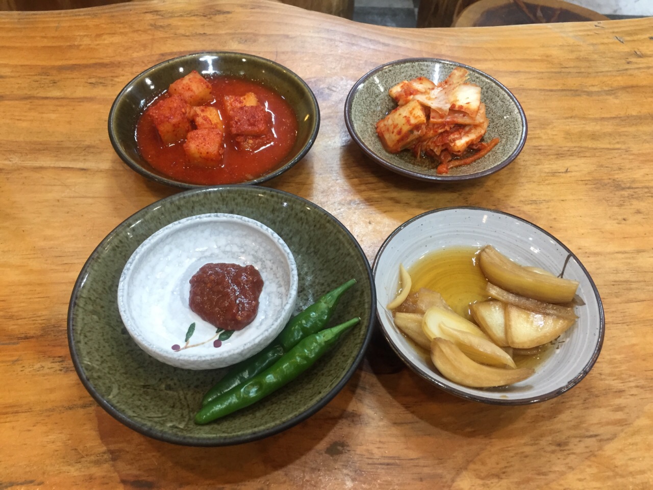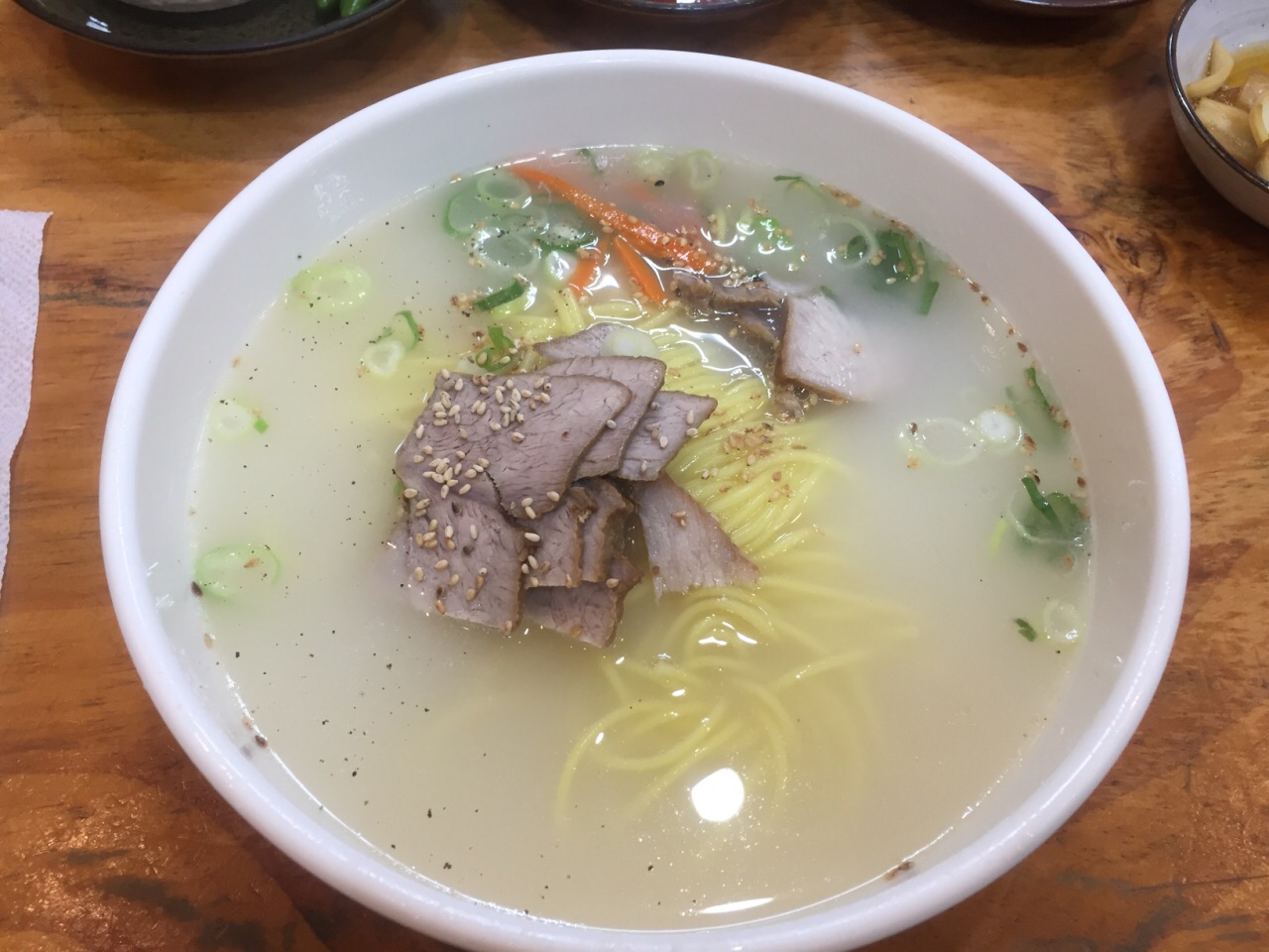知味停車 不能免俗 點了豬肉湯麵 泡菜 生蒜 辣蘿蔔 青辣椒 先上 不一會兒 大碗Q彈的麵上 有切著薄薄的豬肉片 嫣然而至 或者是不放味精的緣故 湯非常非常寡味 加了鹽 胡椒 辣椒粉 還是沒有釜山的豬肉飯好吃 在地食客一波接一波 講中文的遊客也不少 灌了半瓶冰水 埋單 走人~