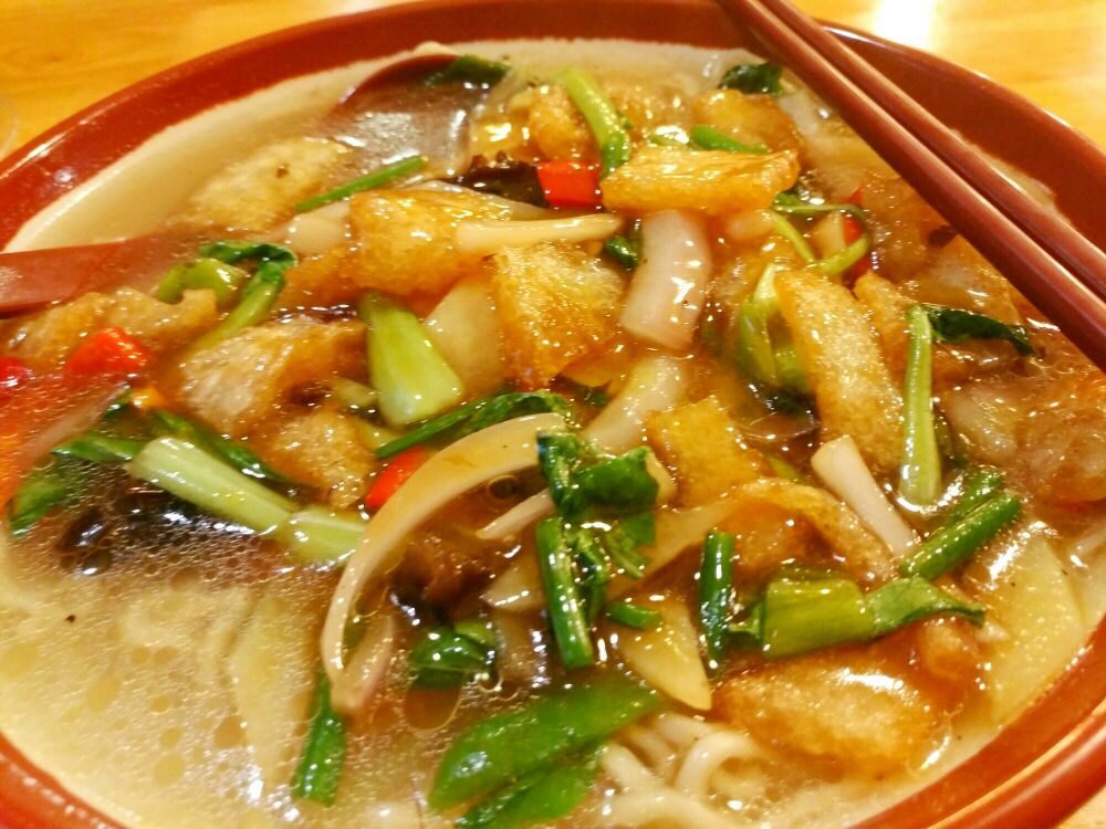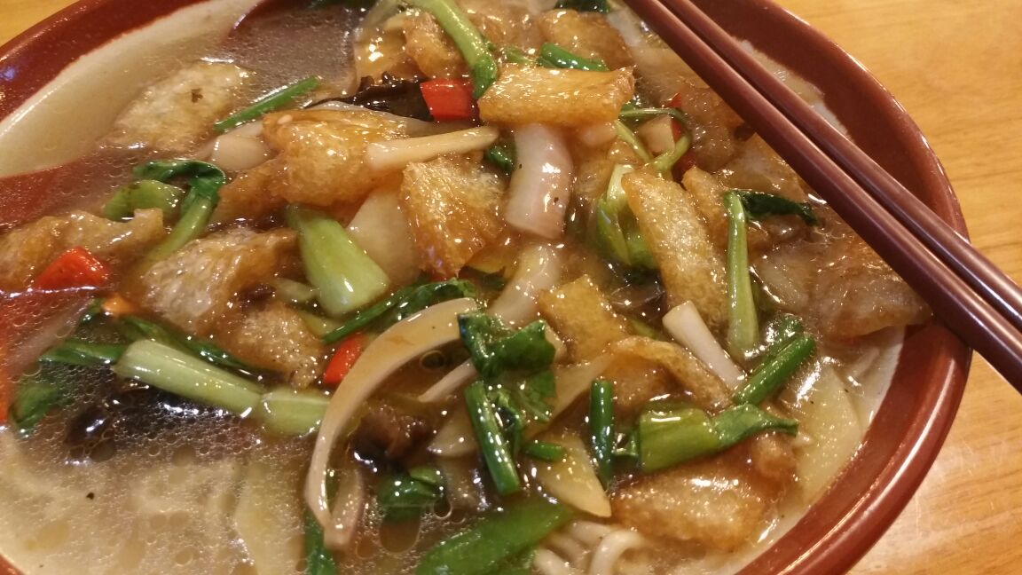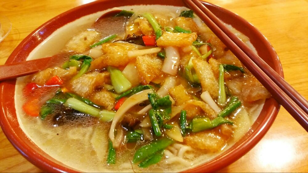 两淮一绝面馆是南京一家主打淮扬口味的面馆,也是一家知名的老字号餐厅。两淮一绝是由清代乾隆皇帝下江南品尝长鱼面而题名的,如今在南京有两家,主要的还是凤凰西街上的这家。凤凰西街又是南京一大美食聚集地,交通便利,位置优越。面馆主打日本暖系风格,以实木为主,环境也特别好,服务也挺周到的。点的是皮肚肉丝面,和南京其他家水煮的不同,他们家是将皮肚、肉丝、洋葱、青菜、木耳、香菇、青椒、红椒等食材爆炒,然后盖到汤面里。色泽浓郁而金黄,散发出阵阵的食物清香。没有过多的佐料,保持食物本身的味道,这是淮扬风味秉承的主旨。整体份量挺足的,面也比较筋道,整个吃下来大汗淋漓。另外,他们家也推出了一系列的盖浇饭、小炒等,味道都很不错,价格也不是很贵。