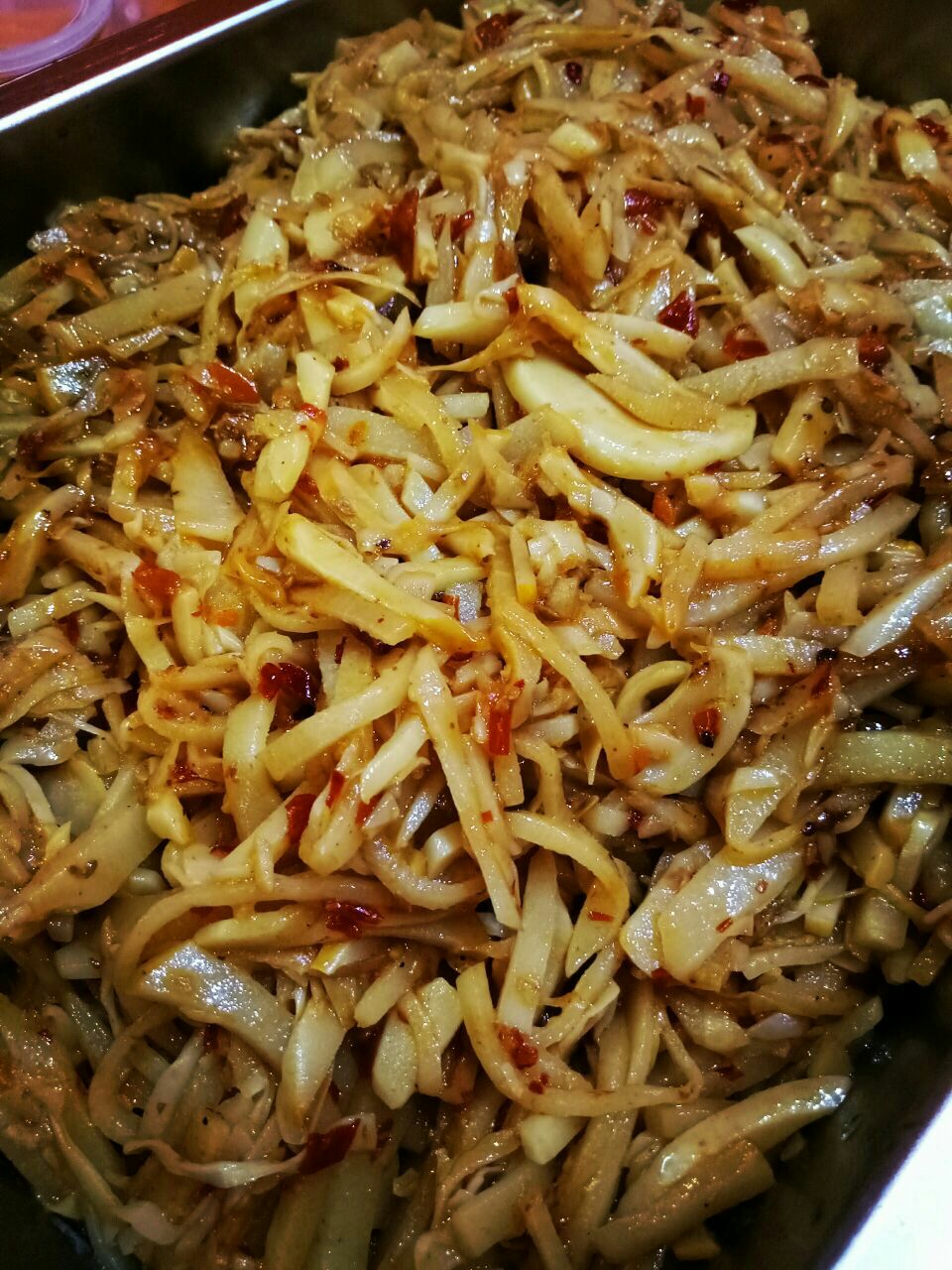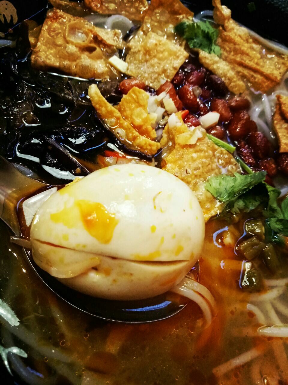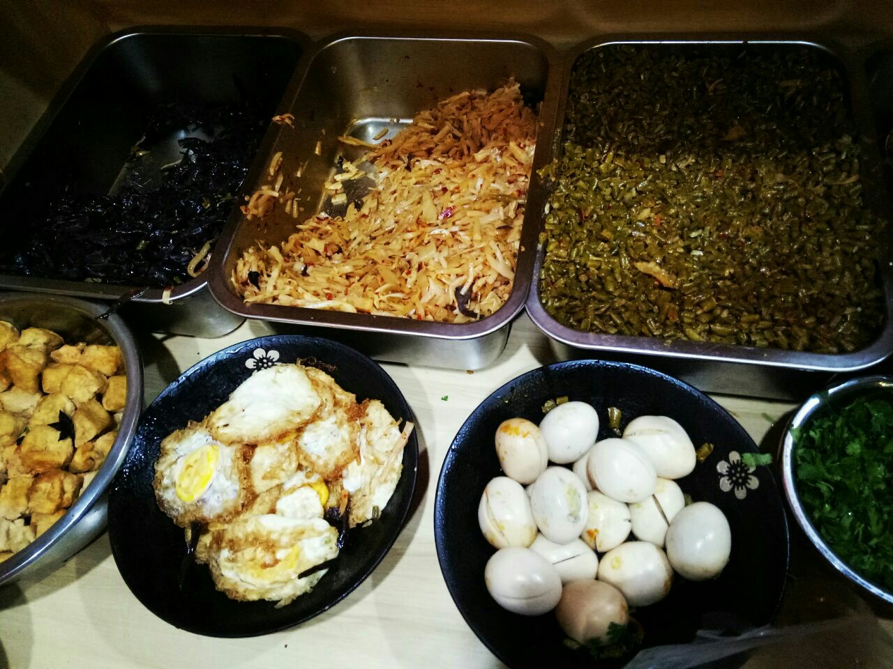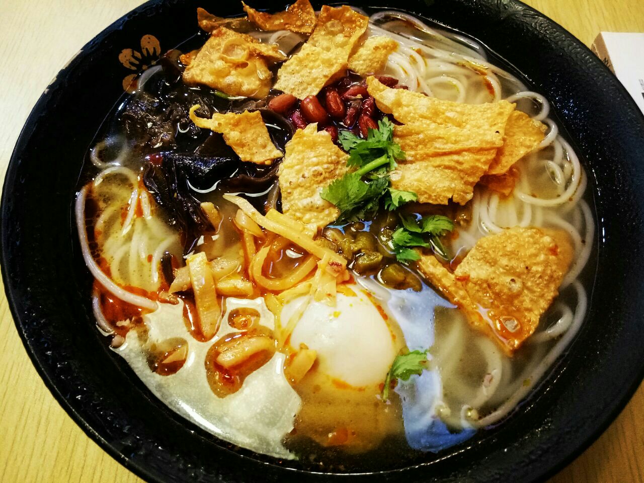...豆皮,白的卤蛋,黑的木耳,红的花生米,绿的香菜,还有点睛的炒酸笋颜值还不错哎朋友讲一定要加酸汁