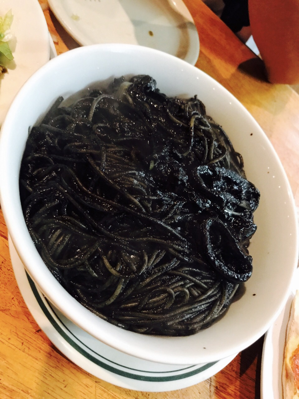 点了传说中超级好吃,而且吃了会牙齿变黑的墨鱼面,一份三文鱼沙拉,一份 pizza。分量真的是很足哦这家餐厅真的是太棒了,味道超级好。点了传说中超级好吃,而且吃了会牙齿变黑的墨鱼面,一份三文鱼沙拉,一份 pizza。分量真的是很足哦!都没吃完,剩了好多,有点可惜!