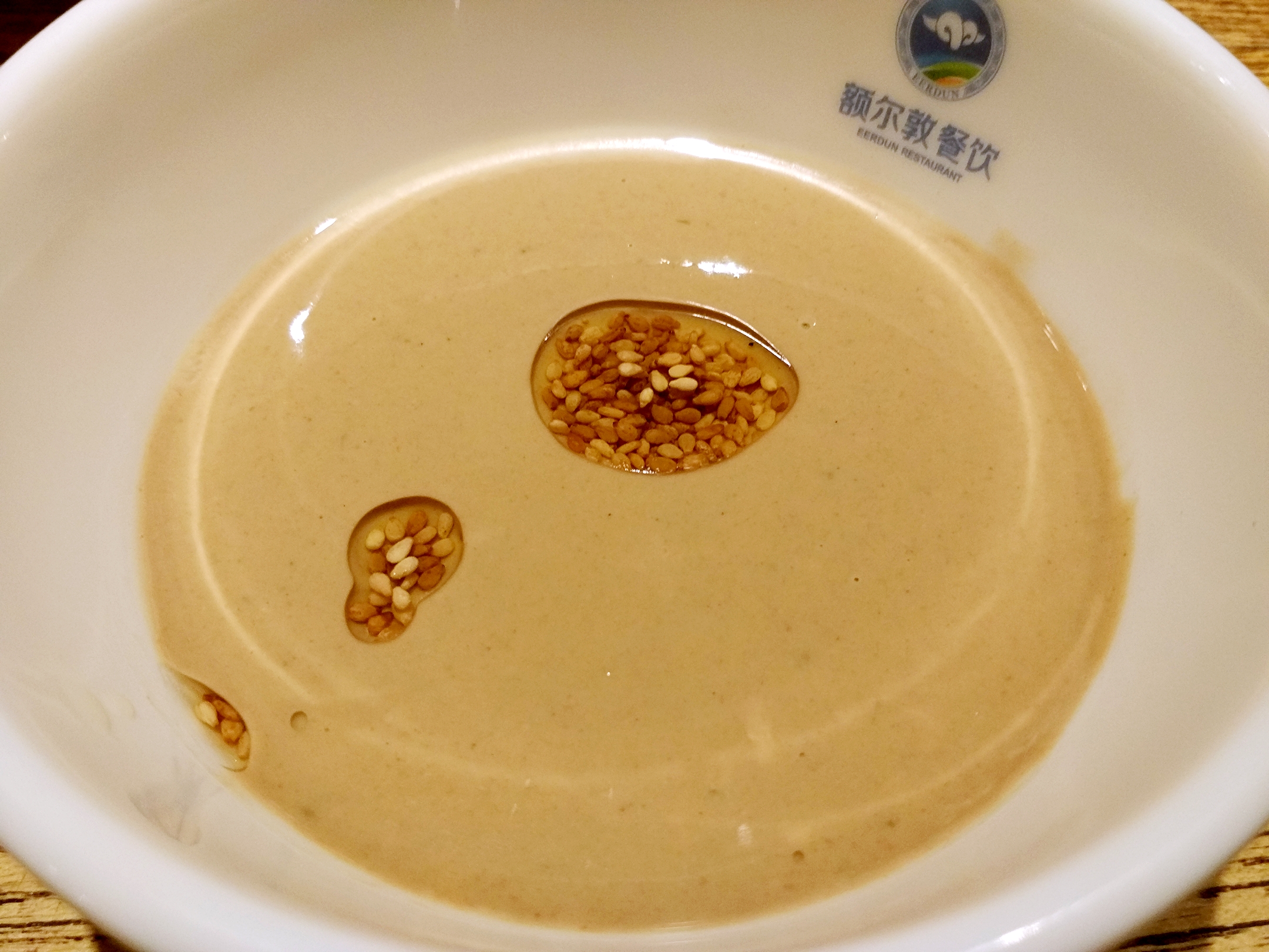 到了呼和浩特,必须来顿羊肉老火锅,因此,被当地人称道的额尔敦传统涮成了我的首选,这个品牌,后续我们旅游包车的司机也很推荐,说这家的羊肉都是自己养的,不从外面购买的,品质有保障的….. 门店餐厅位于石羊桥路跟中山西路交汇处附近,看外墙的形形色色的招牌,就能感觉其内部面积颇大,入店就感受到浓郁的北方古色古香的氛围。 对口接待我们的服务员是个小伙子,风风火火的,很是麻利。 到了北方才知道自己食量小,不得不佩服商家的豪气,买了份所谓的“建议2人使用”的团购:[中山西路] 额尔敦传统涮 仅售138元!价值296元的传统涮精品套餐,建议2人使用,提供免费WiFi,提供免费停车位。 好吧,看看菜品:250g五花羔羊肉、大刀手切肉、羊肉丸子、菌菇蔬菜拼、鲜冻豆腐拼、菜根香、下酒小菜、手擀面等,量大到我们老老少少四人瞠目结舌。 服务员先上了个托盘,里面整齐的摆放了香菜、葱花、花生粒、豆腐乳、蒜泥、香辣酱、额尔敦秘制料、海鲜汁等十二款底料,对于选择控顾客来说,好“残忍”哟! 呲啦作响的铜火锅,涮起羊肉来,特别过瘾,上桌的羊肉没有什么冰冻状,有得只是泛着油亮的热气肉的样子,原汤的存在,则保留了羊肉的鲜感,入口香嫩无膻味;羊肉丸子一盘十二个,翻滚汆熟后,入肚很有饱腹感。 另外,一开始怕不够吃,还多点了烤包子及酒水饮料,给孩子点了份桂花莲子老酸奶,10元,浓稠酸醇的口感,透着奶香。