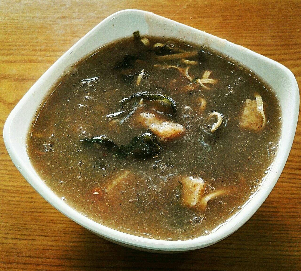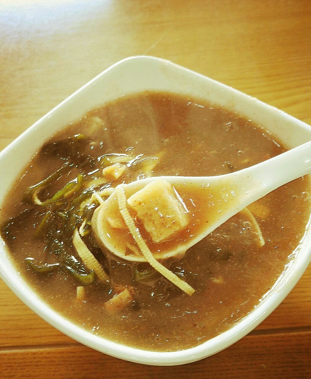...,胡辣汤香辣浓郁,胡椒粉味浓厚,里面有豆腐丝、海带丝、花生、干豆腐等配料,超级好喝,价格也不贵