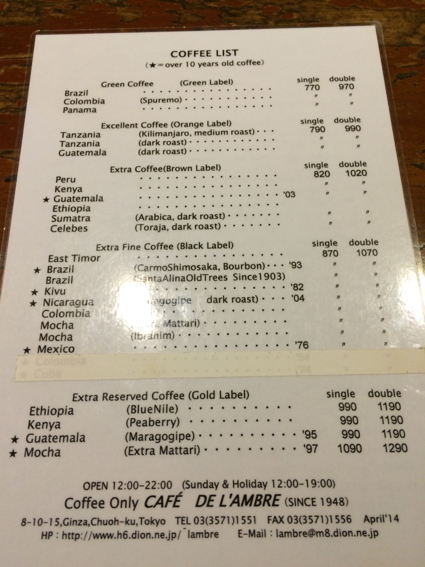 Coffee menu in English