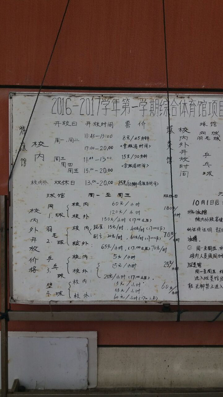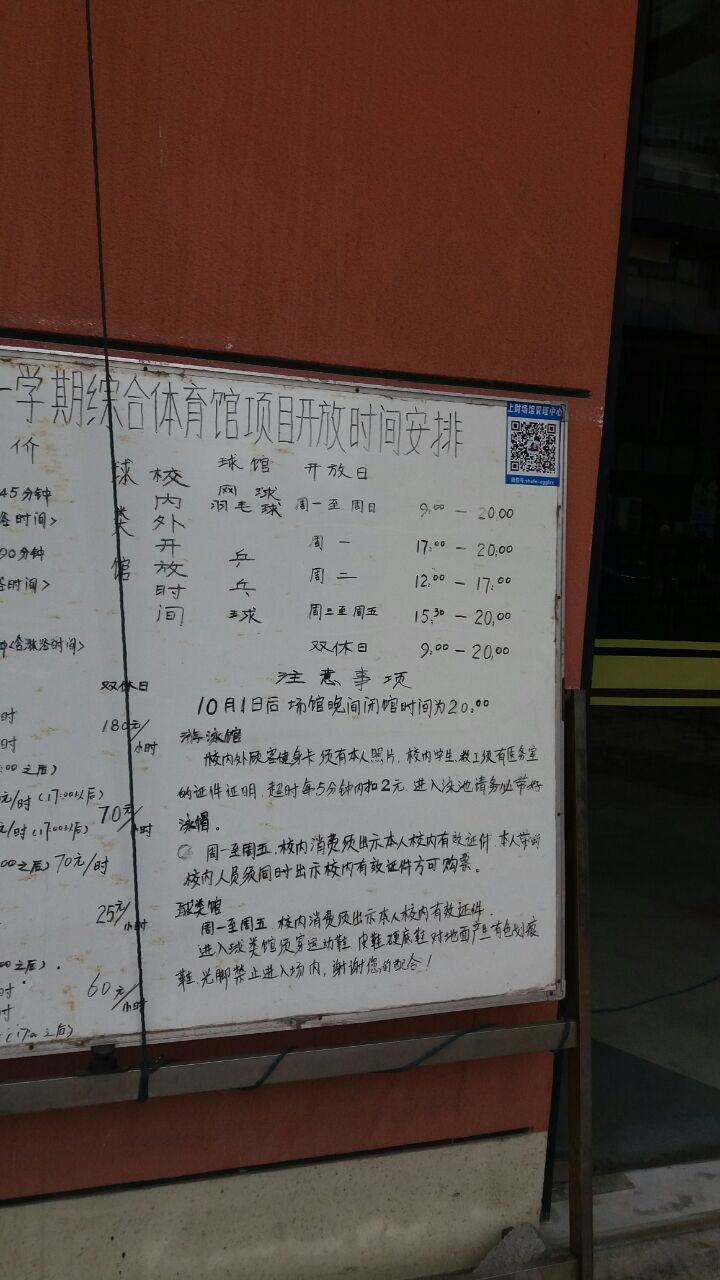 去财大参加一个培训,正好路过那里,就在武川路的门口。这个体育中心很有意思,门口有一块大白板,上面写着各种各样的时间安排,以及对外开放的时间表。体育馆,我到的时候还没有开门,但是从外观上来看,应该是规模很大的。财大的校园因为是新的,所以体育设施非常的丰富,不仅有很大的室外场馆,而且光是室内场馆就有两个。这里有些项目是可以对周边开房的,价格也非常的便宜,所以如果方便的话可以去看一下,不过我感到像这样的场子,在周末应该会比较紧张。这里距离市中心还是挺远的,但是周边的居民也很多,从凉城过去应该是很方便。