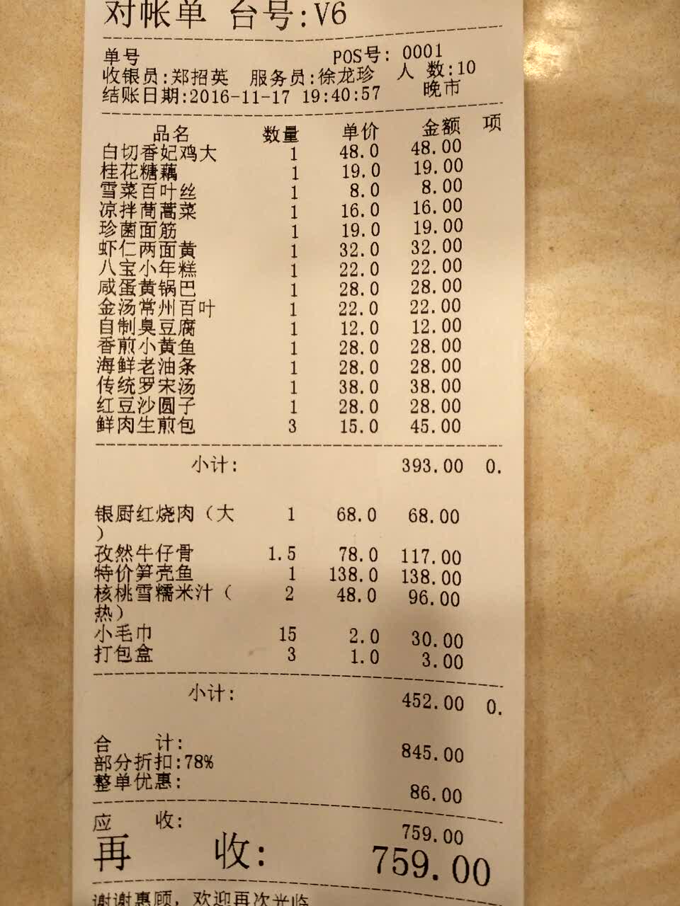 网友2016-11-18菜品口味不错,小黄鱼不新鲜,两面黄很好吃!亲戚选的这家店,在一楼看图点菜,菜色不多亲戚选的这家店,在一楼看图点菜,菜色不多。包间太小了,11个人坐8人的桌子,期间服务员还打翻了饮料,不给于赔偿!菜品口味不错,小黄鱼不新鲜,两面黄很好吃!