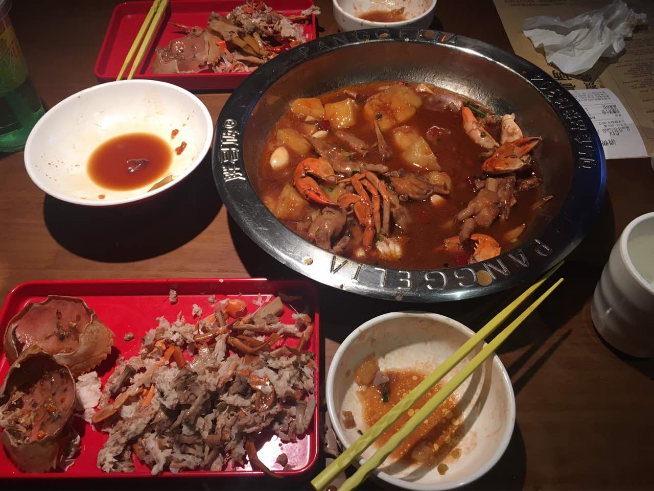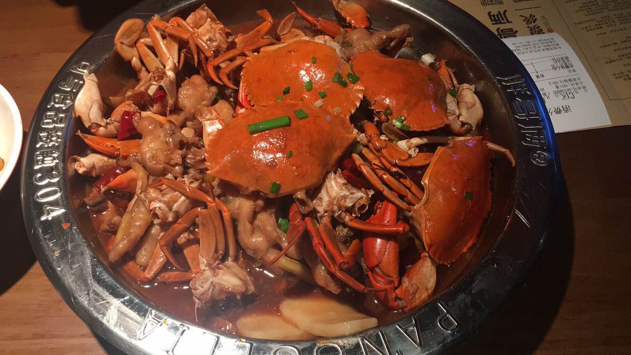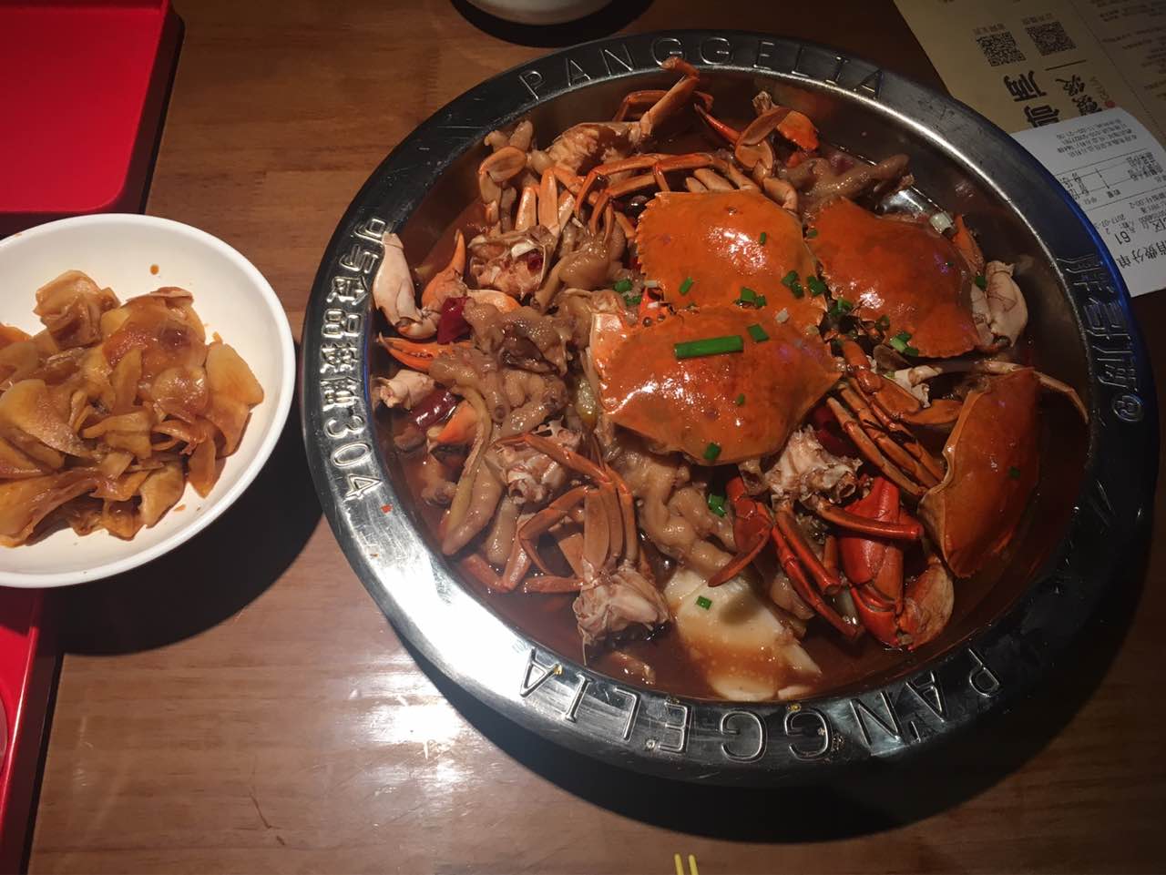 看到很多人排队感觉应该会好吃所以就想去试一下,点了个小份肉蟹煲还有一份萝卜干,两个人吃不完看到很多人排队感觉应该会好吃所以就想去试一下,点了个小份肉蟹煲还有一份萝卜干,两个人吃不完。要的微辣,基本没有辣味,感觉很甜,鸡爪太嫩了不好吃,蟹肉肉不多,感觉一般般吧,两个人只吃了一半,还剩一半。
