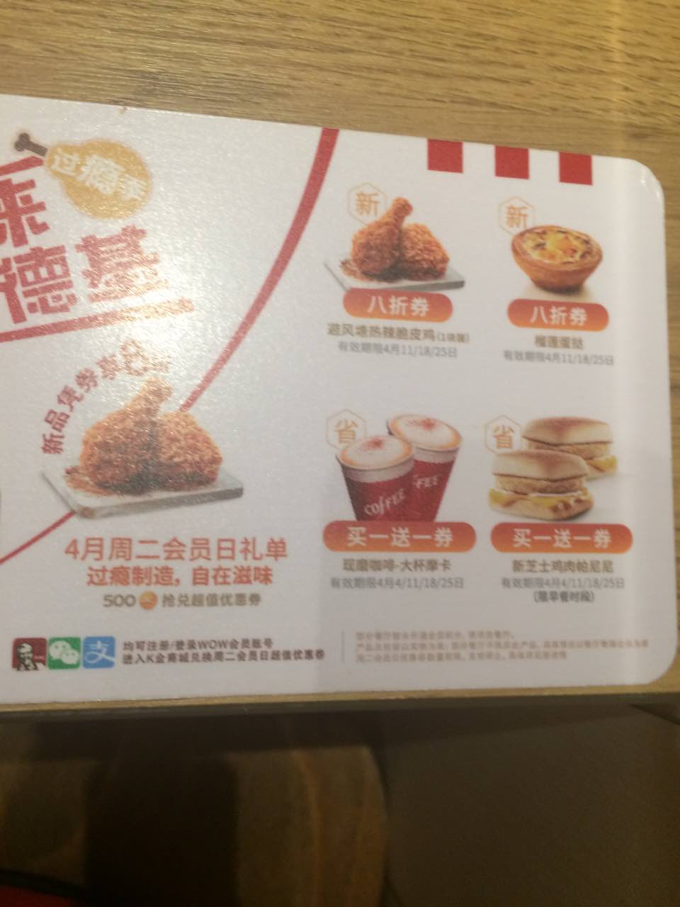 新推出的奥尔良烤翅买一送一到28号一人一次非常合适,薯条给的量也很大,服务也很到位