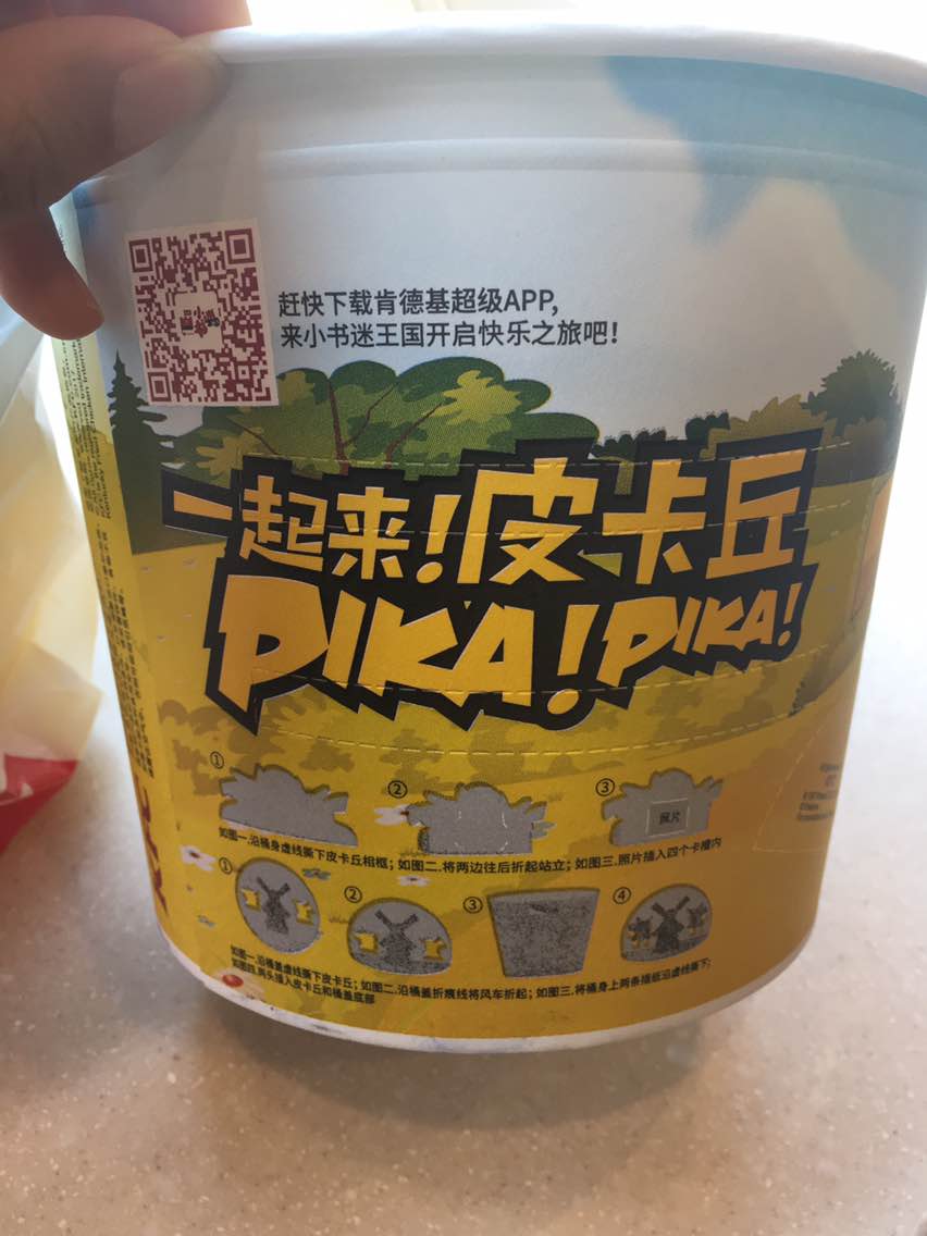 为了皮卡丘套餐吃了好多KFC哈哈哈~服务员小哥帮我找不同的皮卡丘!好评!也很有耐心~套餐配套的盒子也超可爱 舍不得扔掉啊所以就一起带回家啦~不过吃的东西的话 还是喜欢小食里的吮指原味鸡 土豆泥 还有蛋挞!再来一杯雪顶咖啡!棒棒哒!