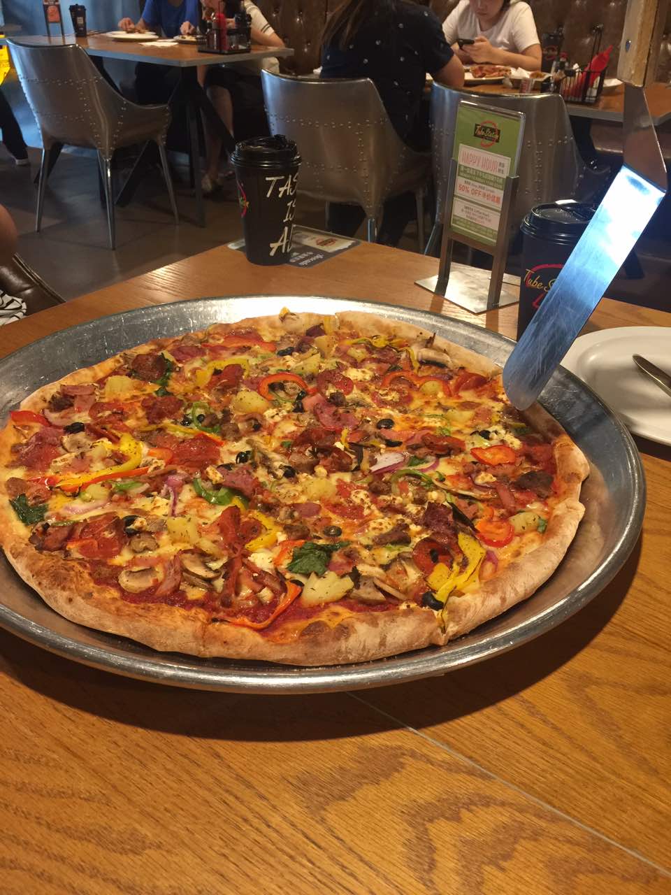 披萨超大,味道也不错,点的饮料还送了玻璃杯。