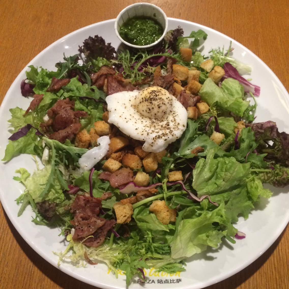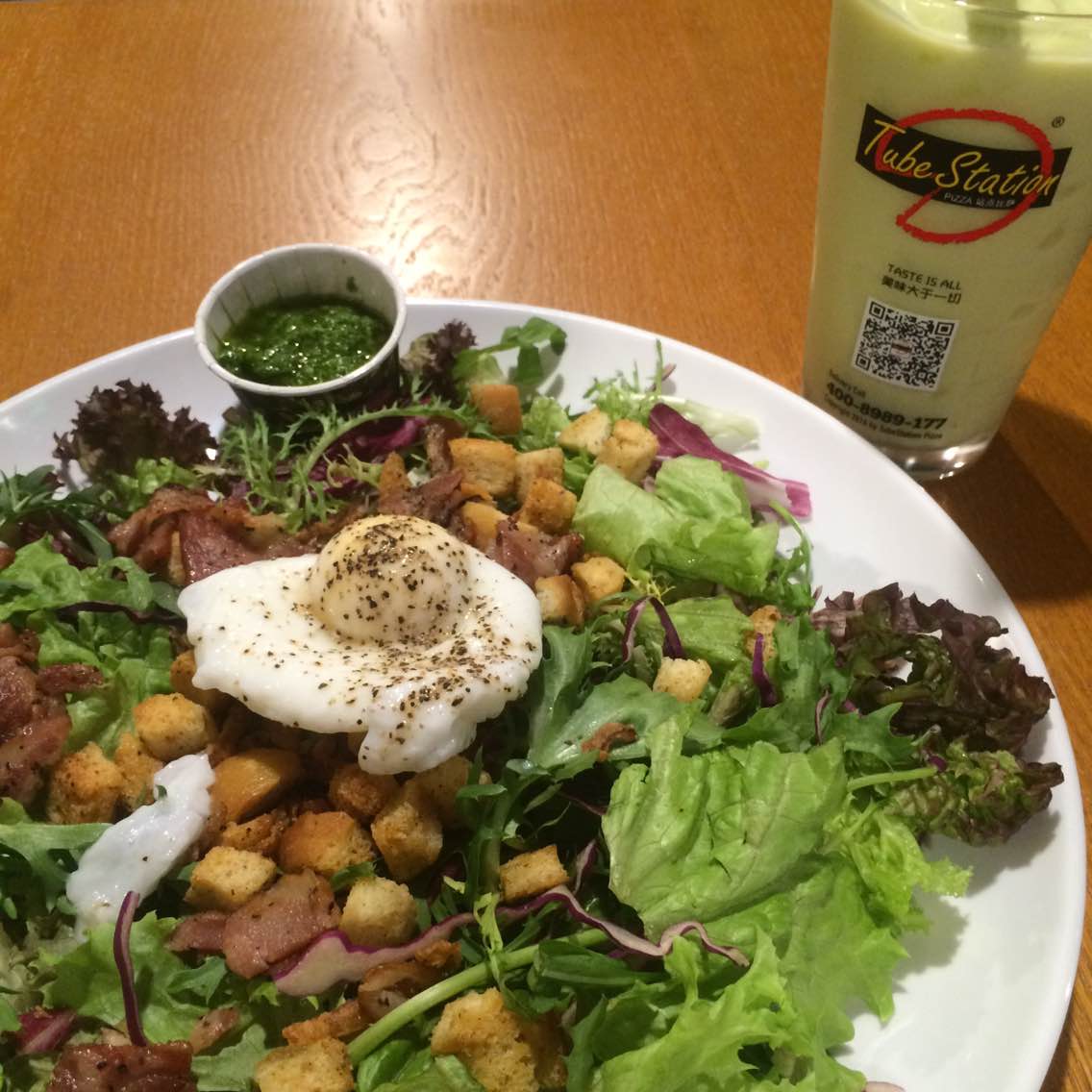 晚餐照例来盆儿草站点沙拉:39元/份。蔬菜有紫生菜,紫甘蓝,芝麻草等,还算丰富,就是太干了,口感不好。建议储存冰箱有order再拿出来。配的罗勒酱,第一次吃,估计也是最后一次吃。没啥香味只不过罗勒剁碎加的橄榄油和盐,更适合拌面,不适合沙拉。牛油果奶昔:38元/份。建议少冰,服务员居然说奶昔的奶是冻成冰块直接打的。噢噢噢……我不禁要联想那你家牛油果又是怎么储存的呢~~~口感清甜味,比较稠,直接倒沙拉上当酱使,蘸面包粒儿。把隔壁桌洋妹子看得一愣一愣的(主要是她点的pizza还没上就瞎张望)沙拉的量还是有,作为pizza荤素搭配很营养的。适合多人happy hour 有happy的垃圾桶pizza