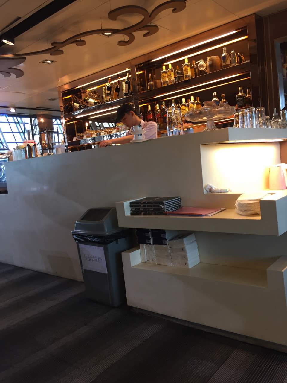 酒吧区域有帅哥 服务员英文很好 坐等面条来开吃 味道很不错 有康师傅的感觉
