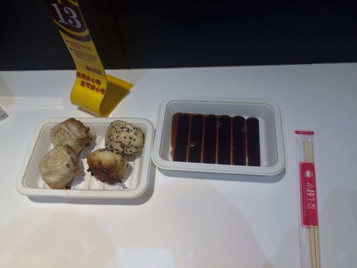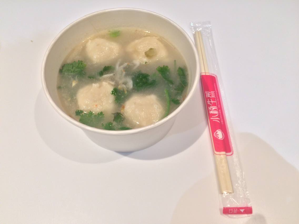 小杨生煎( 常州月星环球港),晚上江南环球港散步一圈下来,肚子咕咕叫,一看小杨生煎,全国连锁,中粮食材!果断点了鲜肉、大虾生煎,共4只。鱼丸汤,一碗。店面小而精,没洗碗的地方,无奈之下,只能采用一次性环保餐具!