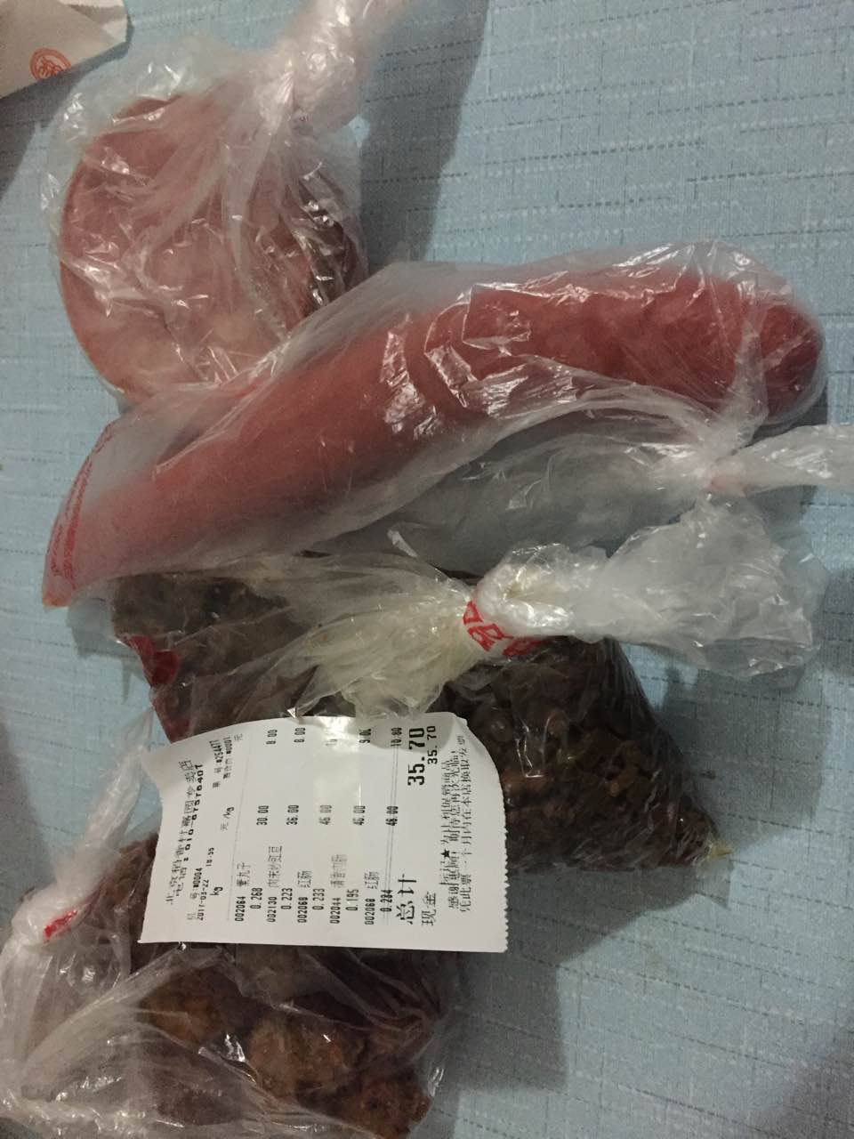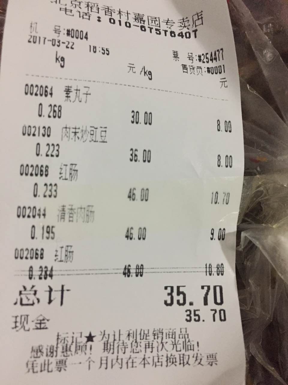本来为了打发时间来这里买了些熟食,排队时候人很多,等了很久,结账到我时候小票没了,工作人员让我稍等,然后重新去屋里拿了条码纸换上,然后我就支付宝付了,没有看账单。结果出去吃完饭晚上到家才发现多扫了一个不知道是谁的红肠,这还好我看了一下,是不是不看被多刷钱了也不知道?!附上购物清单,有点小不爽哎~