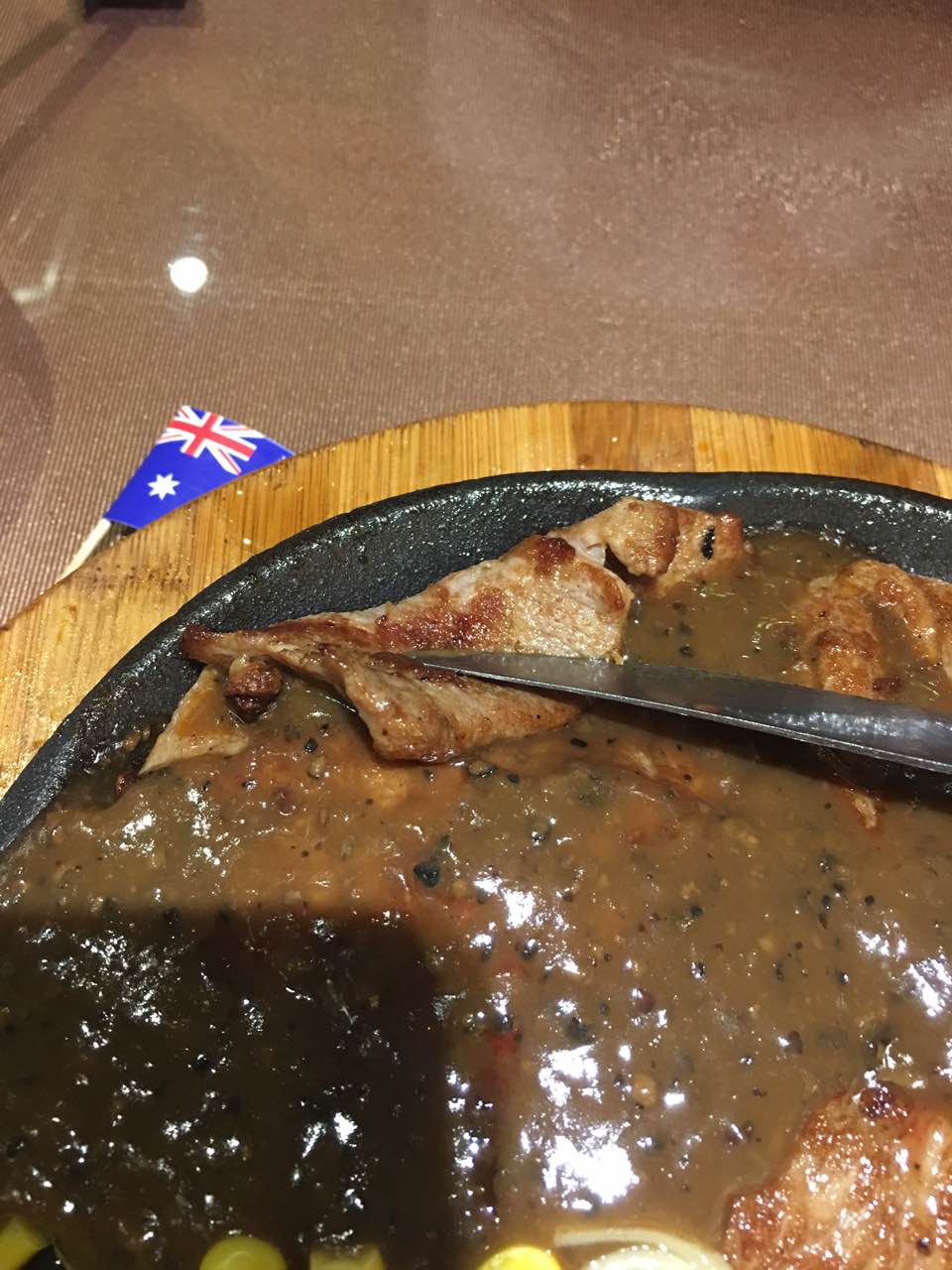 点了两份澳洲精选牛排套餐,7分熟。上的粥是凉的。说给换但是餐都用完了还没给上来。牛排第一次直接煎炸至金黄后的地方发黑,咬不动,所以换了第二份,比第一次稍好点,但依旧咬不动。还有很多所谓的筋。牛排里的配菜西兰花吃到嘴里好像坏了的。讲真,这里的牛排一次不如一次,水果沙拉也是一次不如一次,柚子根本咬不动。不会再来。