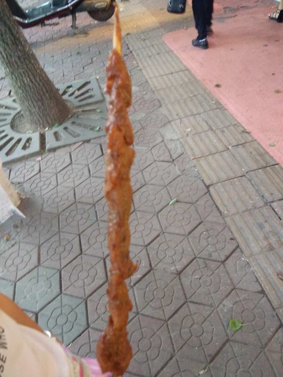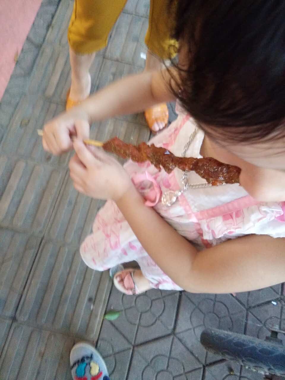 买给她们两个小孩子吃的,看她们吃得高兴,自己也挺高兴的。看她们吃的样子肯定挺美味的,我给她们买的是串鸭肉。